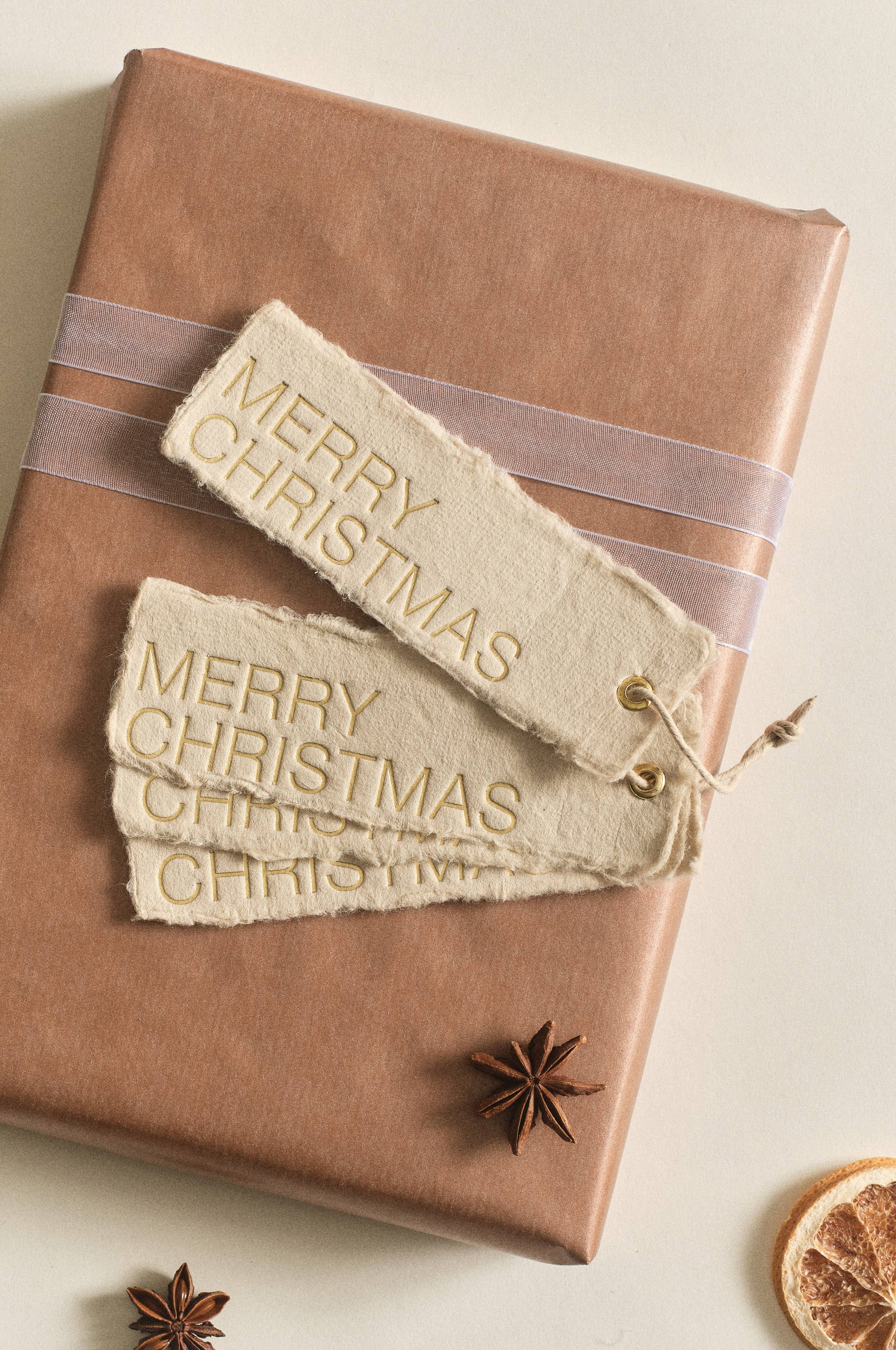 4 papierowe etykietki z napisem w kolorze srebrnym lub złotym. Etykietki są ręcznie wykonane, więc każdy świąteczny prezent i wręczany w okresie świąt upominek nabierze luksusowego charakteru. W każdej etykietce umieszczone zostało metalowe oczko do przewleczenia sznurka (sznurek sprzedawany jest osobno).