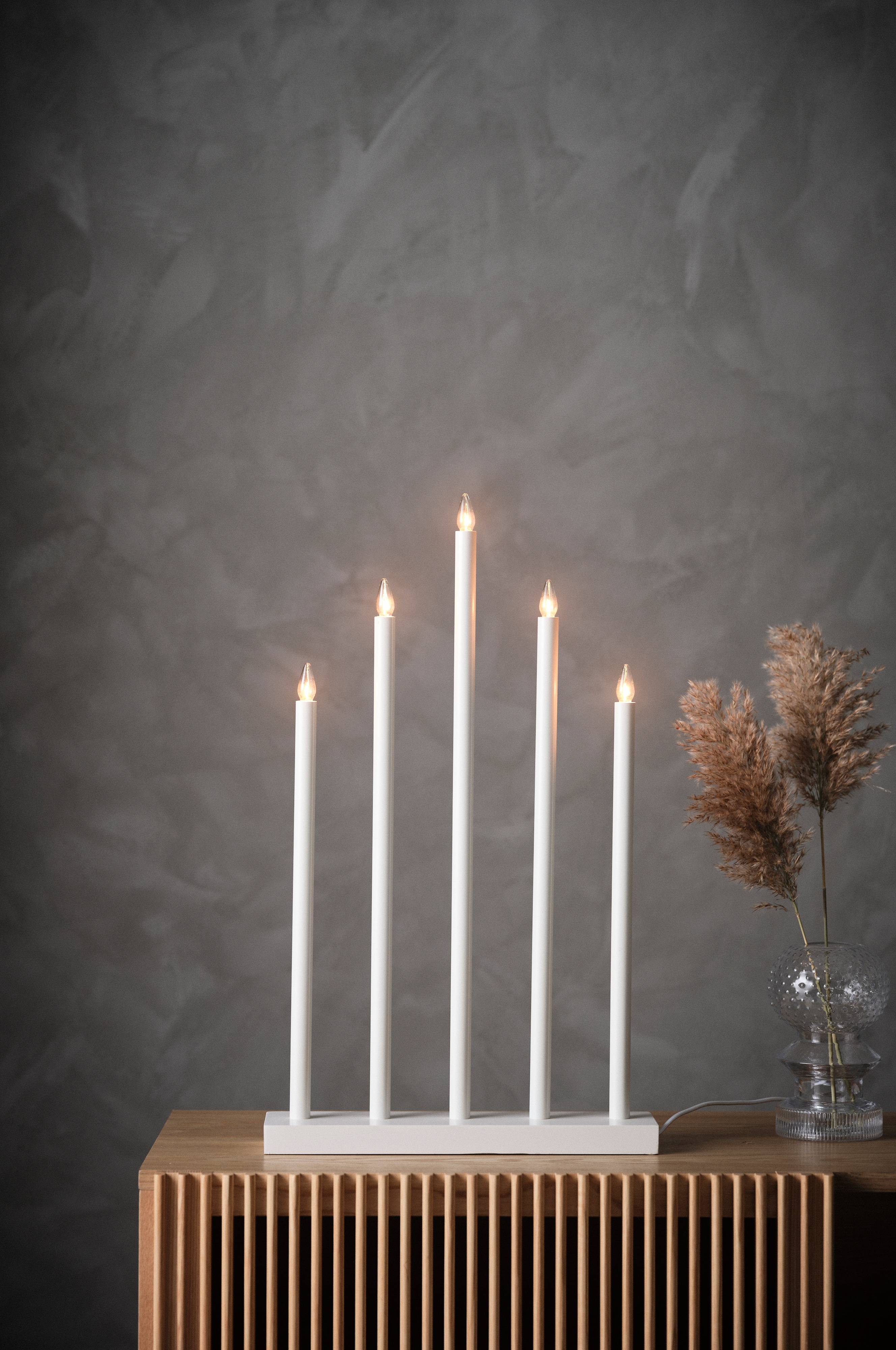 Prosty świecznik z metalu z pięcioma żarówkami. Do użytku w pomieszczeniach. Biały przewód w oplocie tekstylnym 1,8 m. Żarówki sprzedawane oddzielnie.