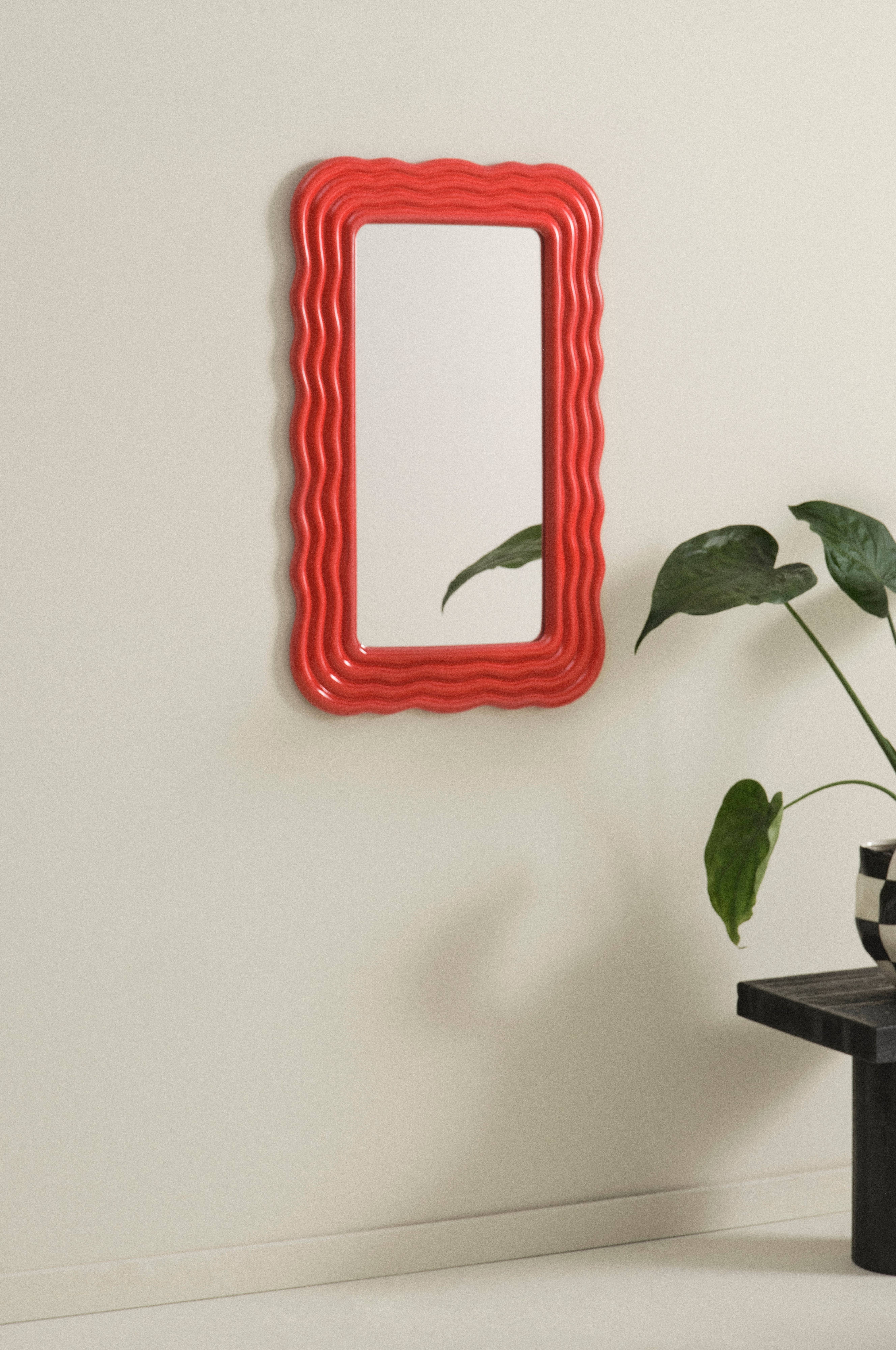Prostokątne lustro w szerokiej, falistej ramie z żywicy epoksydowej. Rama dodaje całości charakteru i wnosi odrobinę nostalgii. Styl retro pogłębia również wykończenie ramy na wysoki połysk. Lustro wyposażone jest w ukryty uchwyt umożliwiający zawieszenie w dwóch pozycjach w zależności od potrzeby, pionowej lub poziomej.
