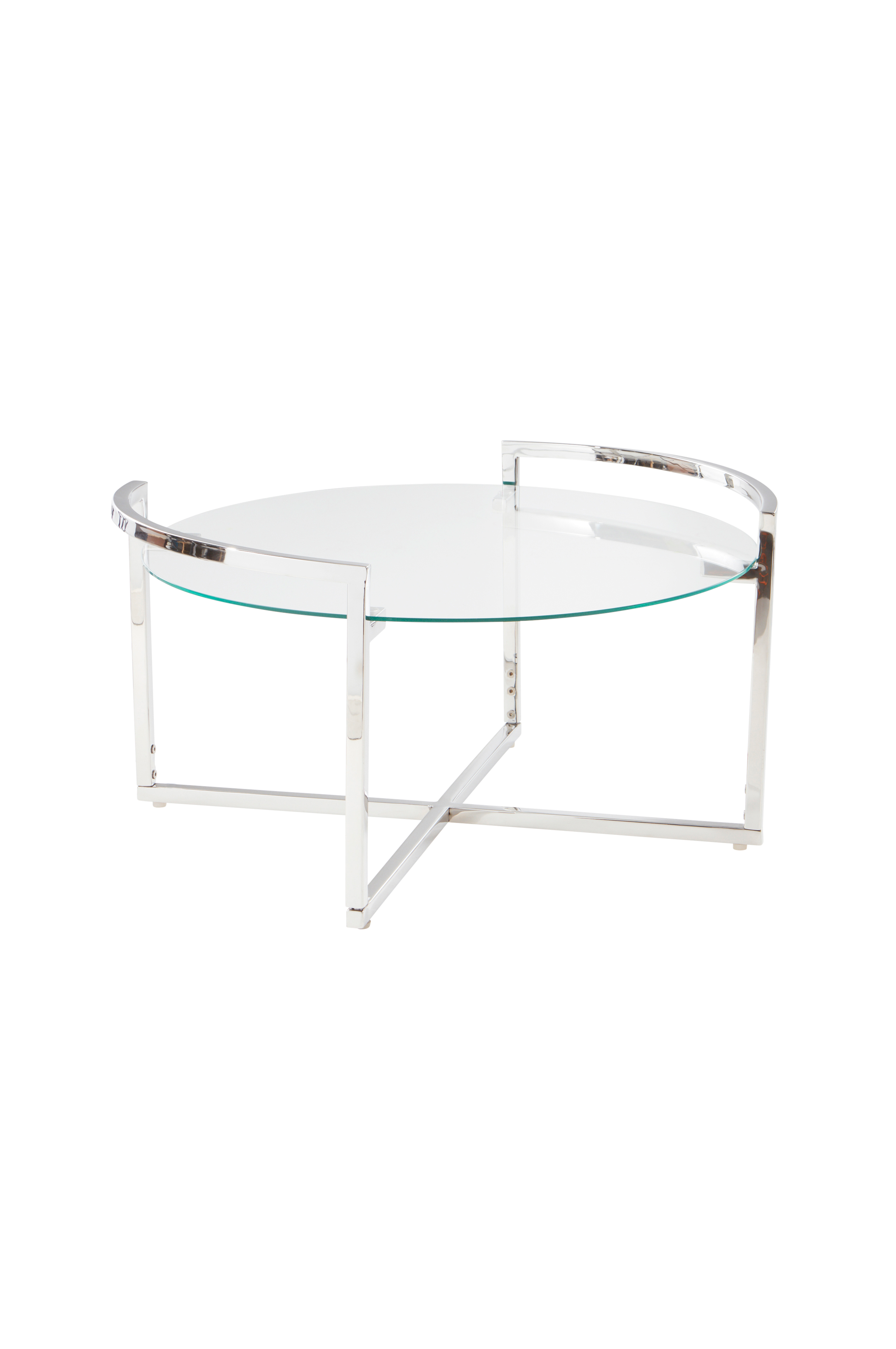 Okrągły stolik kawowy z blatem z hartowanego szkła i żelaznymi nóżkami z powierzchnią o wysokim połysku. Szklany blat w połączeniu ze stalową ramą, która wznosi się ponad blat, nadają stolikowi szczególnego charakteru. Podstawa ma nowoczesny i stylowy design, który dodaje lekkości i świeżości. Stalowa rama jest prostokątna, z miękko zaokrąglonymi krawędziami, a blat zdaje się zatapiać w nogach stolika. Wymaga częściowego montażu.