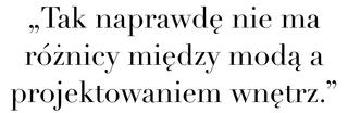Niezależnie od tego, czy urządzasz hotel, czy dom, zachęcam do myślenia o nim jako o całości. Ośmiel się, zgromadź w jednym miejscu wiele elementów, zostaw jednak również pustą przestrzeń na regenerację. Zacznij urządzać wnętrza dla siebie. Jeśli czytasz książki, wykorzystaj je jako element dekoracji. Niech przestrzeń będzie dynamiczna oraz użyteczna. Pracuj na kontrastach; jak duży obok małego, klasyczny obok czegoś bardziej surowego - ekstrawaganckiego. Tak naprawdę nie ma różnicy między modą a projektowaniem wnętrz.