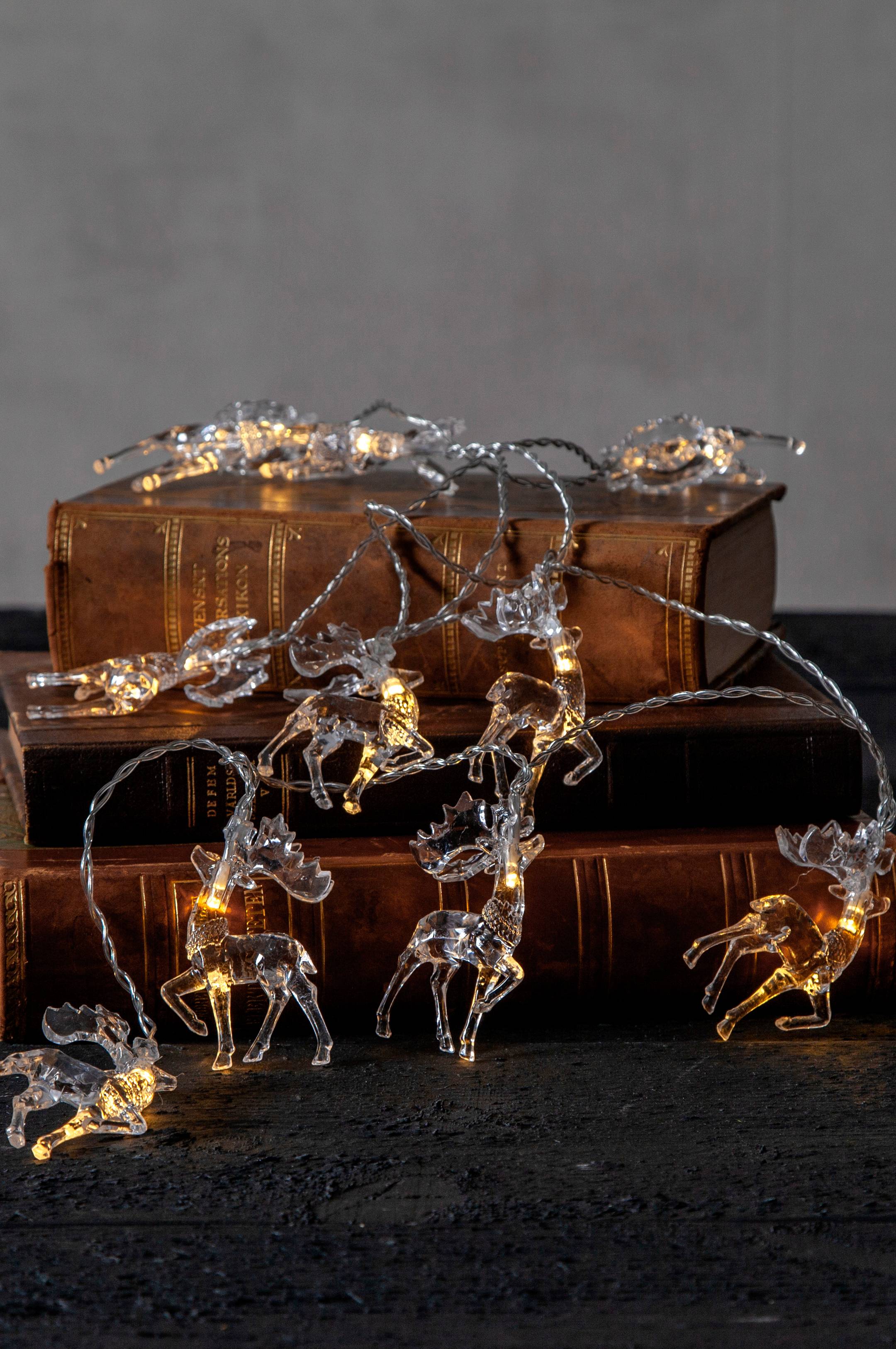 Nastrojowa girlanda świetlna zasilana na baterie z przejrzystymi reniferami, które roztaczają przytulny blask. Girlanda do użytku w pomieszczeniach. Ta piękna girlanda może zawisnąć na choince, w oknie lub ozdobić nakryty stół. Granice wyznacza jedynie wyobraźnia. Przezroczysty przewód. Produkt zasilany 2 bateriami AA do kupienia osobno.