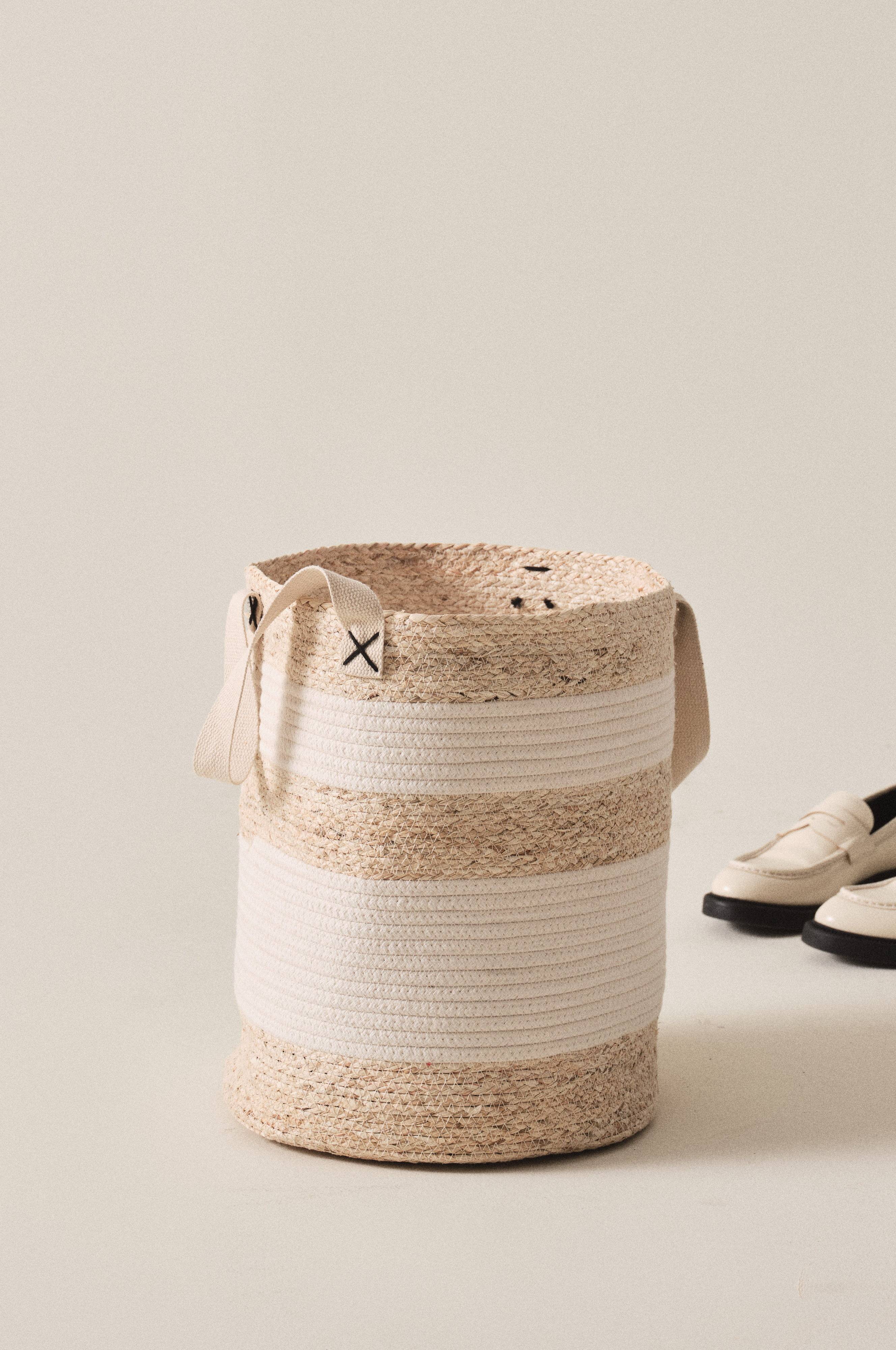 Kosz do przechowywania wykonany z trawy morskiej i bawełnianego sznurka. Pleciony, dwukolorowy kosz wyposażono dodatkowo w dwa tkane uchwyty. Trawa morska to naturalny materiał cechujący się naturalną różnorodnością kolorów, zależną od warunków, w jakich rosła trawa. Każdy kosz jest wyjątkowy.
