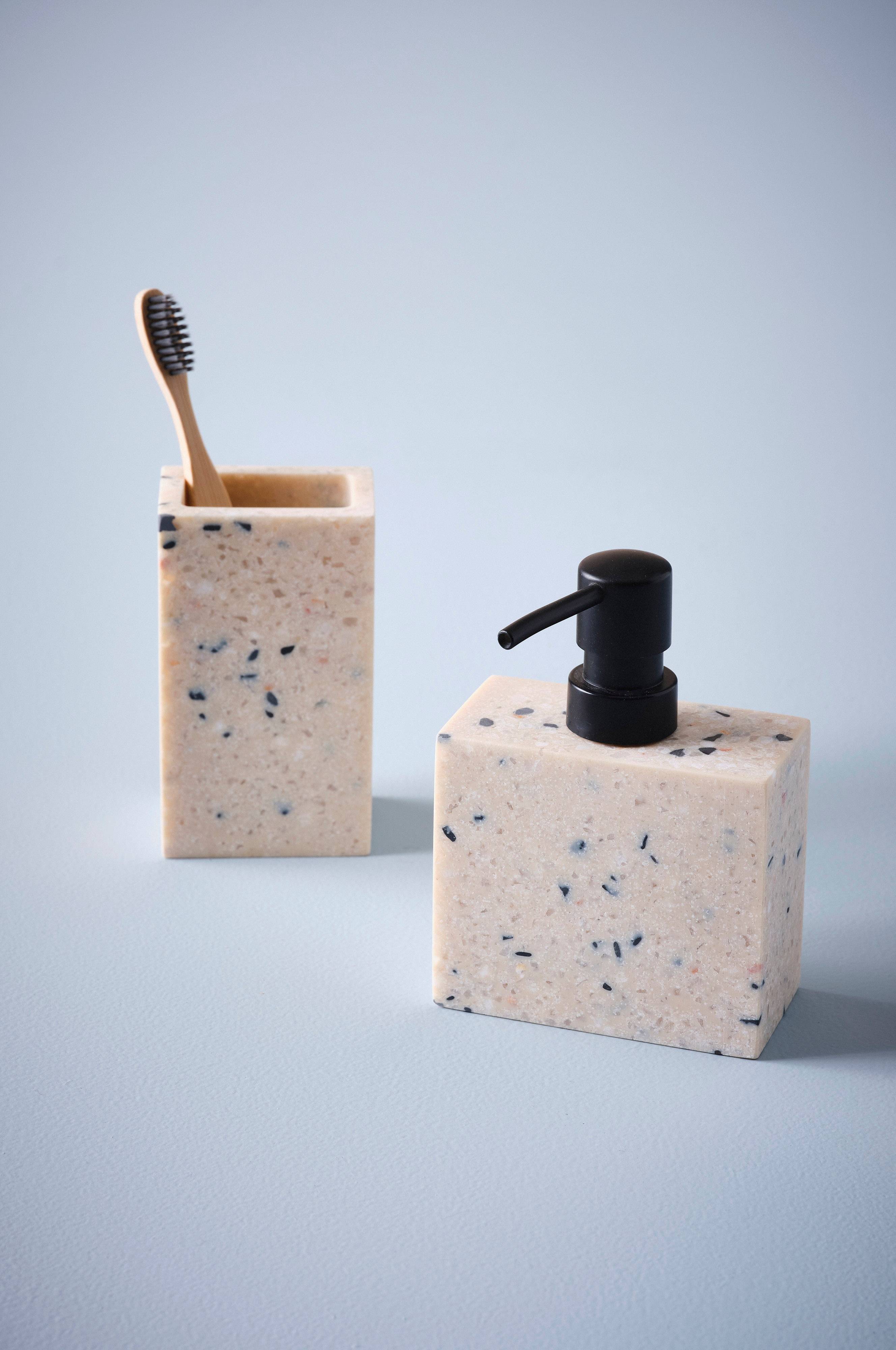 Zestaw łazienkowy z dwoma elementami z żywicy polimerowej. W skład zestawu wchodzą kubek i dozownik z pompką. Dozownik uzupełnisz ulubionym mydłem w płynie - kupowanie zapasu to lepszy wybór dla środowiska, ponieważ w ten sposób zmniejsza się ilość plastiku. Można go też z powodzeniem użyć do balsamu albo szamponu.