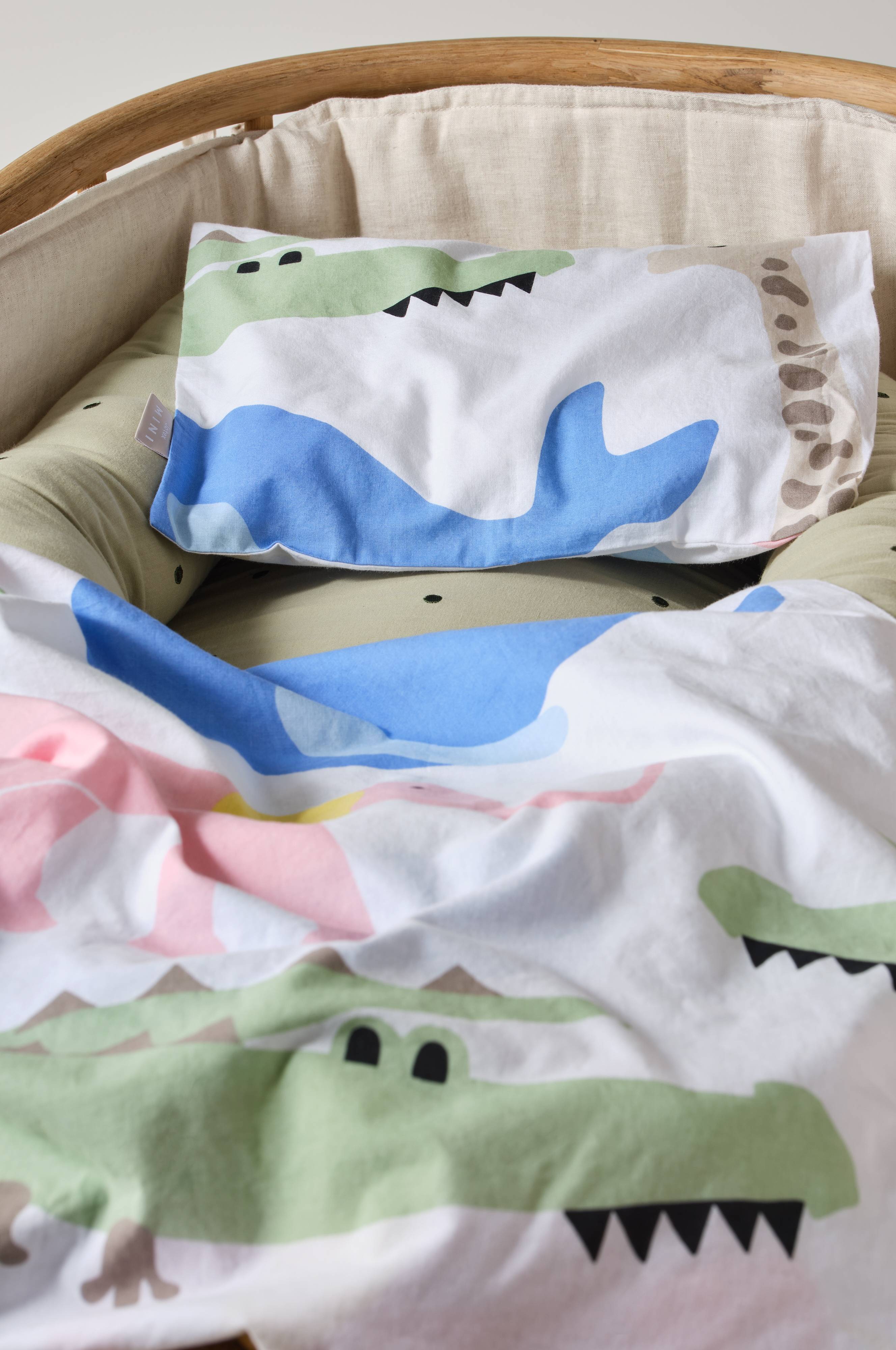Wzorzysty komplet pościeli do wózka dziecięcego lub kołyski z poszwą na kołdrę i poszewką na poduszkę uszytymi z przyjemnej, ekologicznej bawełny. Tkanina została poddana praniu przemysłowemu dla uzyskania większej miękkości, bawełna jest chłodna i przyjemna dla skóry. Wzór w czystych, radosnych kolorach został nadrukowany na białym tle. Gęstość splotu materiału wynosi 144 TC. (Gęstość splotu materiału oznacza ilość przeplecionych ze sobą nici, thread count, na cal kwadratowy materiału. Im wyższa gęstość tym lepsza jakość.)