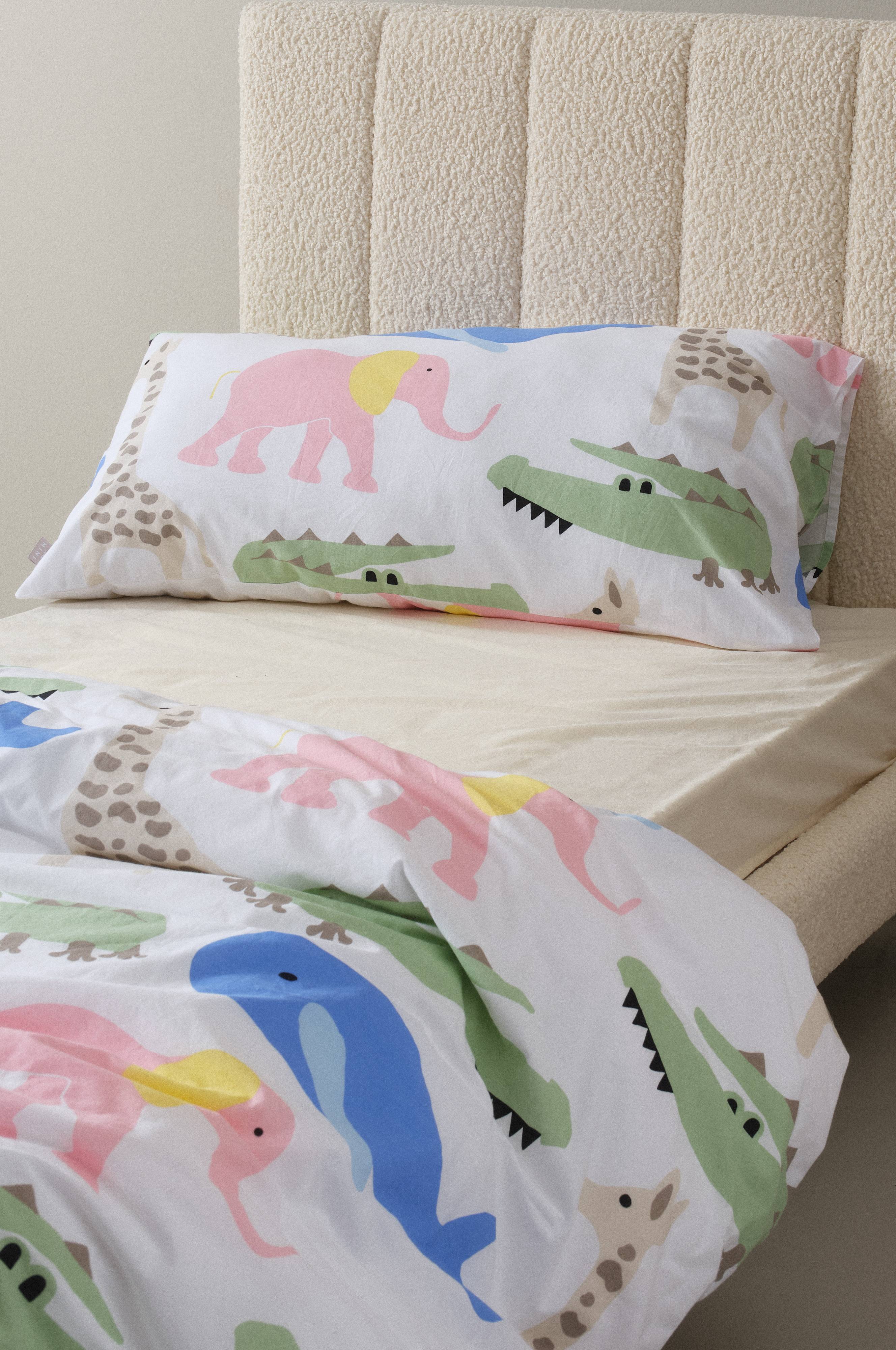 Wzorzysta poszewka na poduszkę wykonana z przyjemnej, ekologicznej bawełny. Tkanina została poddana praniu przemysłowemu dla uzyskania większej miękkości, bawełna jest chłodna i przyjemna dla skóry. Wzór w czystych, radosnych kolorach został nadrukowany na białym tle. Gęstość splotu materiału wynosi 144 TC. (Gęstość splotu materiału oznacza ilość przeplecionych ze sobą nici, thread count, na cal kwadratowy materiału. Im wyższa gęstość tym lepsza jakość.)