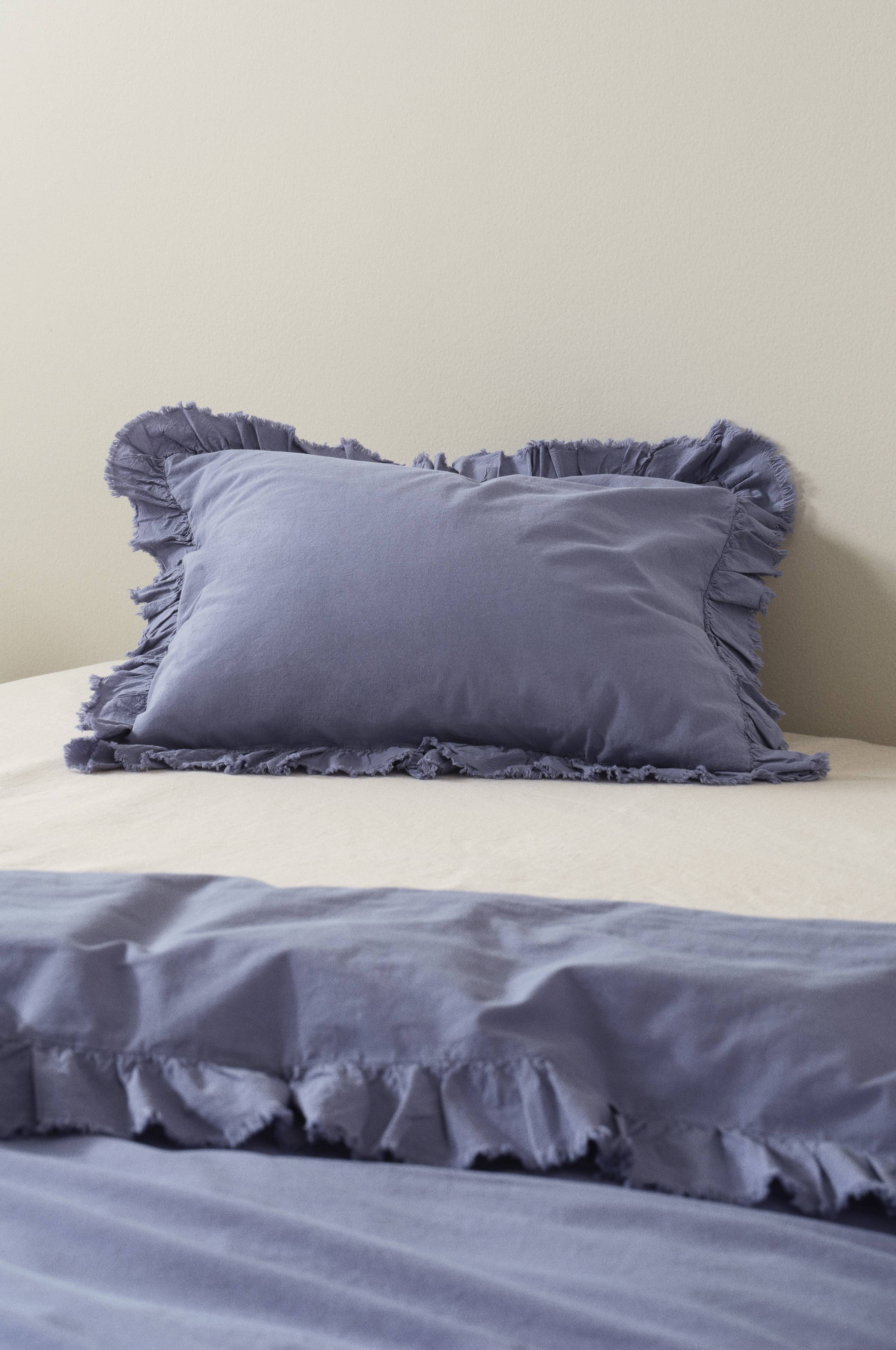 Poszewka została uszyta z miękkiej, spranej bawełny. Bawełna jest świetnym materiałem na pościel, ponieważ pozostaje chłodna i przyjemna dla skóry. JINN została ozdobiona biegnącą wokół, delikatną falbanką. Gęstość splotu materiału wynosi 144 TC. (Gęstość splotu materiału oznacza ilość przeplecionych ze sobą nici, thread count, na cal kwadratowy materiału. Im wyższa gęstość tym lepsza jakość.)