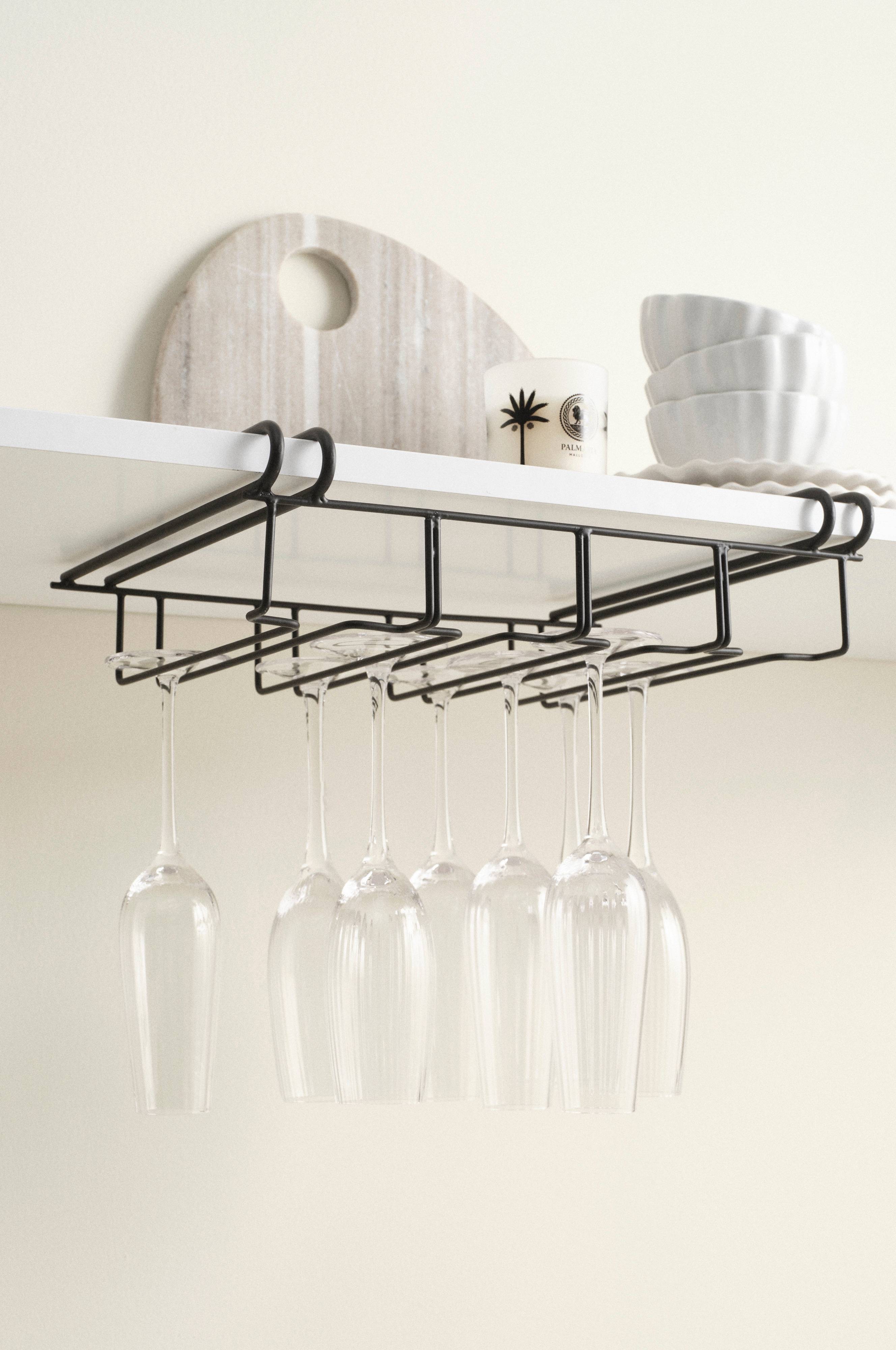 Wieszak na kieliszki do szampana wykonany z żelaza, łatwy do zawieszenia pod dowolną półką. Wieszak ma formę czterech szyn w które wsuwasz stopkę kieliszków w taki sposób, by czary zwisały poniżej. Idealnie pasuje do otwartych półek, a Ty zyskujesz dekoracyjne i praktyczne miejsce do przechowywania kieliszków do szampana. Szyna jest malowana na matową czerń.