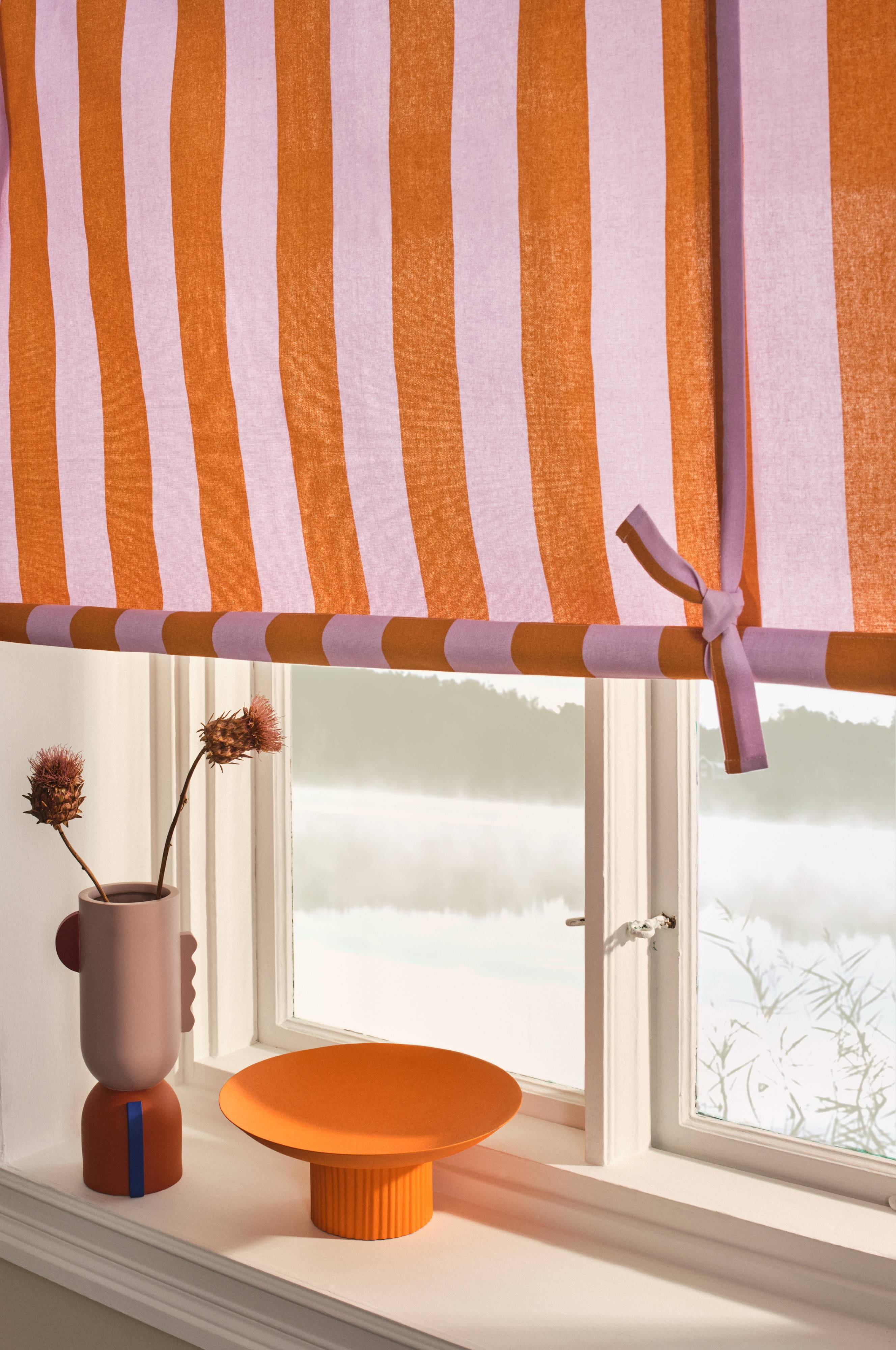 Bawełniana roleta ze wzorem grubych pasów w kontrastowych kolorach, nadrukowanym na bawełnianej tkaninie. Roleta do zawieszenia na zwykłym karniszu. Wysokość rolety regulowana jest wiązanymi tasiemkami.