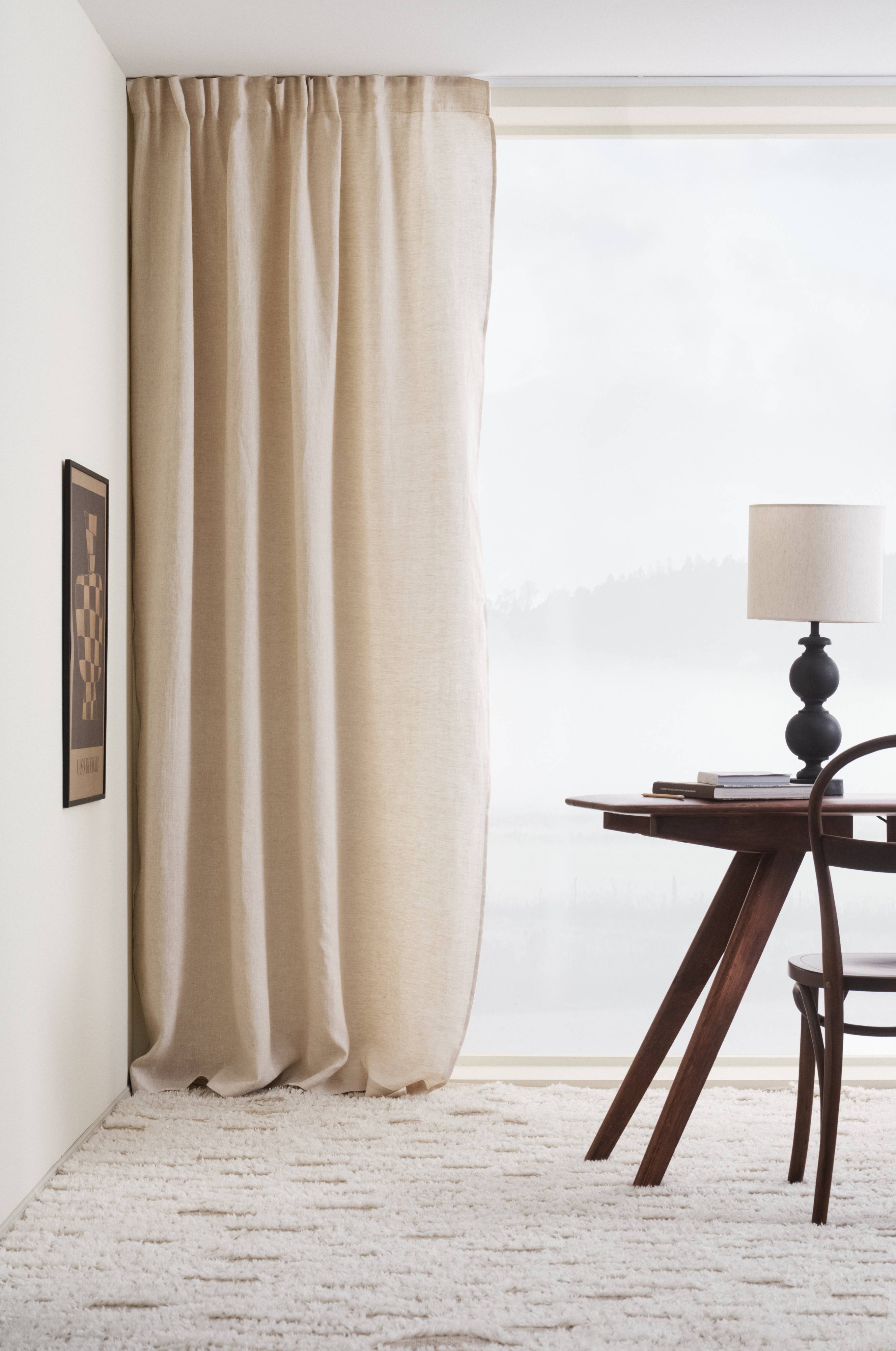Zasłona z miękkiego, elastycznego lnu o wysokiej jakości, który oprócz doskonałych właściwości lnu jest również wodoodporny. Len posiada certyfikat European Flax. Obróbka akrylanowa, której nie widać ani nie czuć, nadaje tkaninie właściwości hydrofobowe, co daje jej szerszy zakres zastosowań, zarówno wewnątrz, jak i na zewnątrz. Pościel ma wszyte wielofunkcyjne paski i można ją zawiesić za pomocą haczyków na palce, kanału lub ukrytego wieszaka.