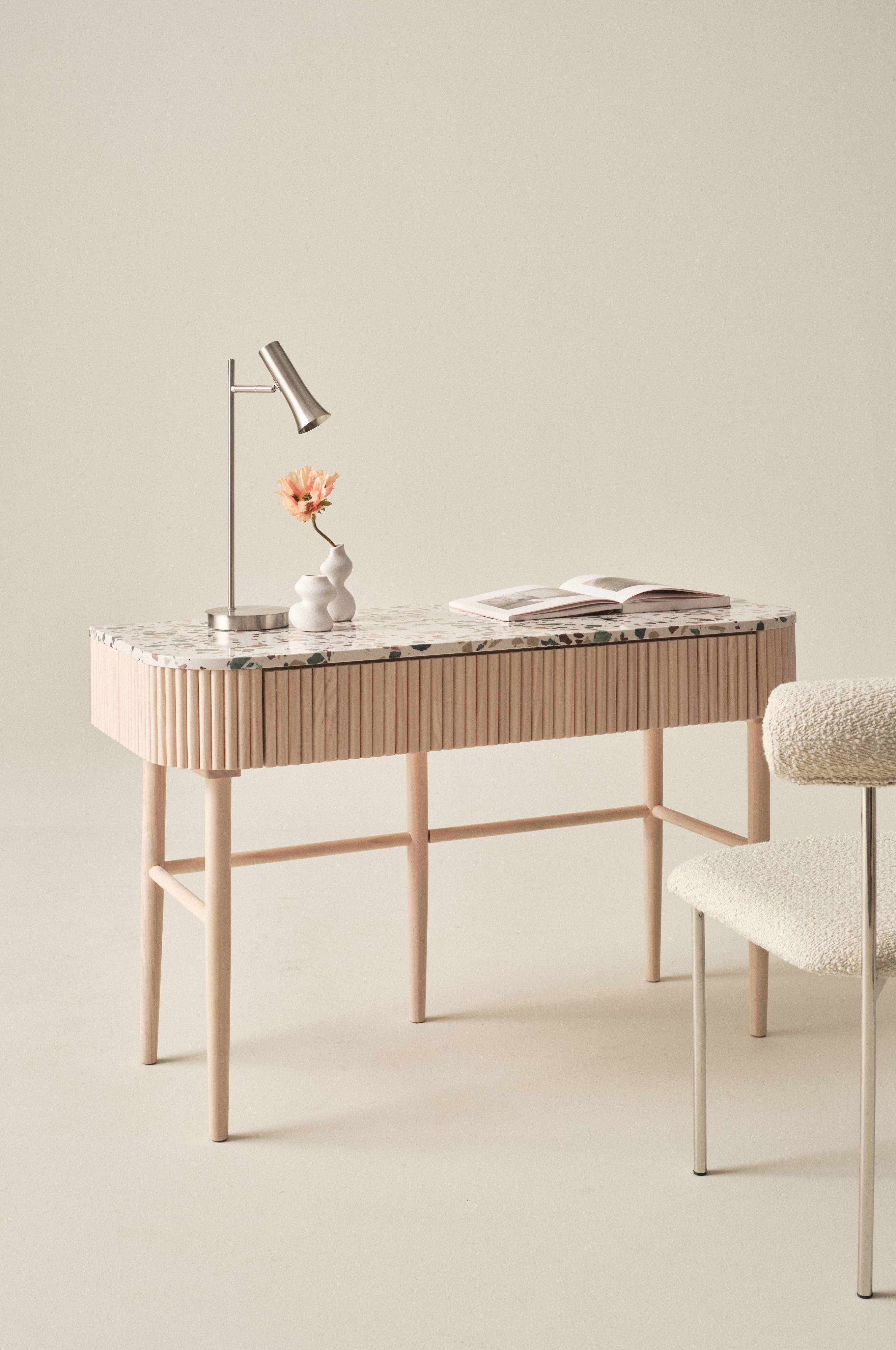 Biurko z litej sosny oznaczonej certyfikatem FSC, na której ustawiono blat z lastriko. Lastryko mieni się głęboką czerwienią, beżem oraz zielenią na jaśniejszym tle, a jego przednia krawędź ma zaokrąglony kant. Wokół biurka biegnie listwa wykonana z półokrągłych drążków, w samym środku konstrukcji znajduje się duża, ukryta szuflada. W dolnej krawędzi szuflady znajduje się uchwyt a brak gałki sprawia, że jest niewidoczna. W szufladzie można przechowywać, na przykład, klawiaturę i myszkę. Biurko ustawione jest na pięciu okrągłych, smukłych nogach. Rozmiar biurka sprawia, że można je ustawić w wielu miejscach otrzymując w ten sposób praktyczne i eleganckie domowe biuro, które raczej ozdobi pokój niż przemieni je w pracownię. Wymaga częściowego montażu. Do produktu dołączona jest instrukcja montażu.