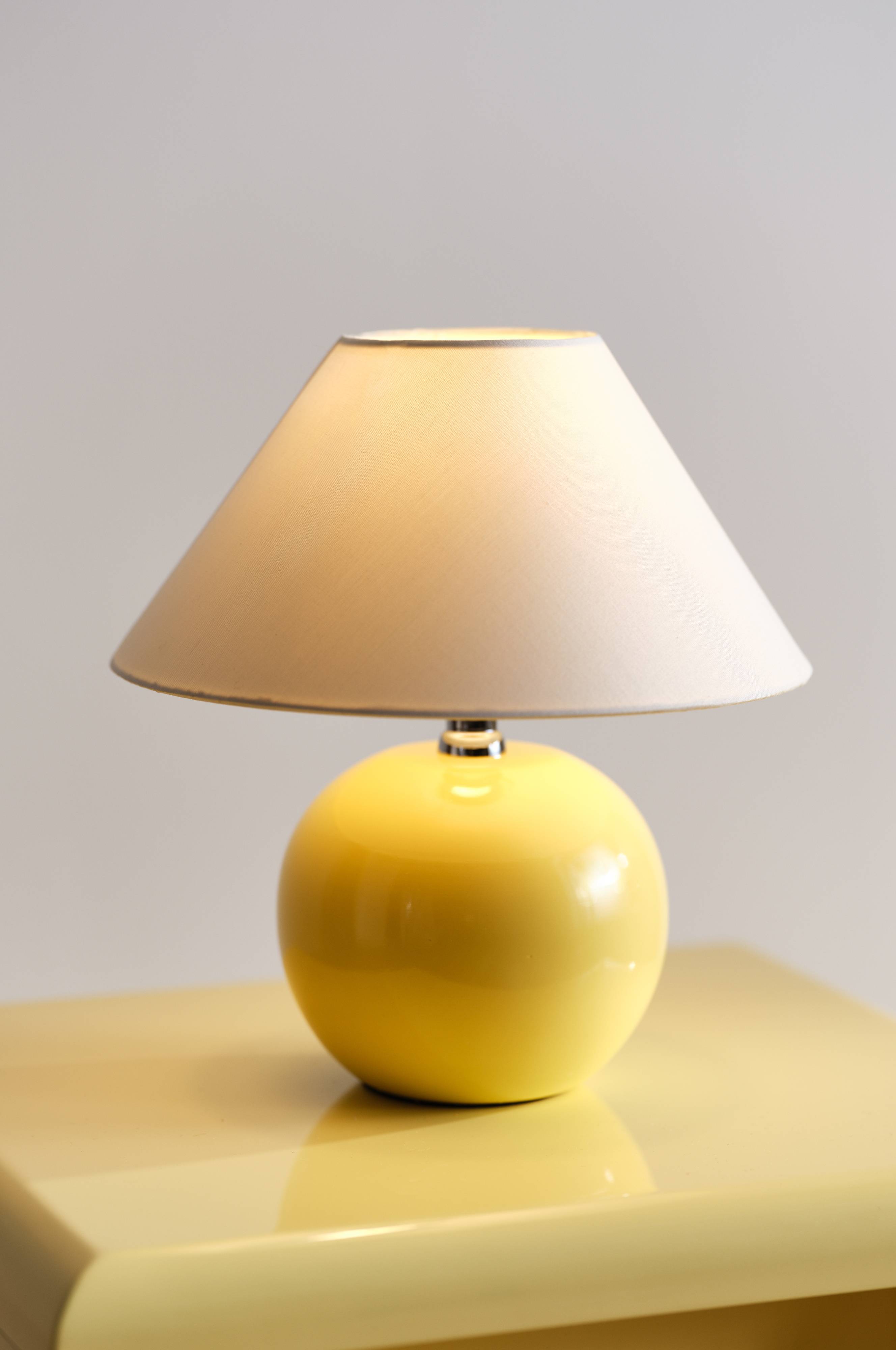 Lampa stołowa KARAMELL wniesie szyk do wystroju Twojego domu. Wyposażona w miękki, bawełniany klosz i błyszczącą ceramiczną podstawę, ta lampa o wysokości 29 cm oferuje stylową równowagę formy i funkcji. Elegancki stojak z białej stali i chromowany uchwyt dodają jej współczesnego uroku. Dzięki praktycznemu przełącznikowi kablowemu i kompatybilności z żarówkami E14 o maksymalnej mocy 8 W, jest idealna do stworzenia przytulnej atmosfery. Żarówka nie wchodzi w skład zestawu.