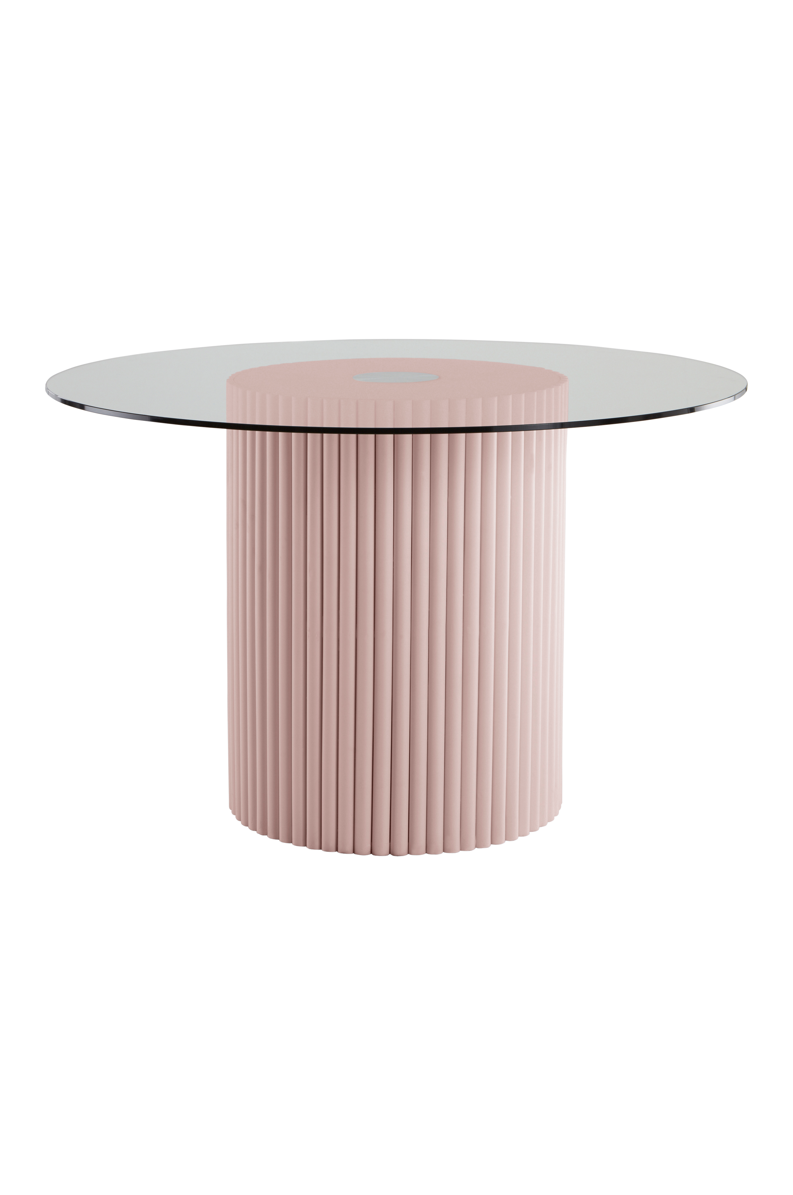 Okrągły stół z blatem z przejrzystego szkła oraz nogą z sosny i płyty MDF. Noga stołu zawdzięcza swój falisty kształt sosnowym, pokrytym farbą listwom wygiętym w łuk. Pomalowane drewno i przejrzyste szkło tworzą ciekawy kontrast. Okrągły stół zapewni, że nikt w towarzystwie nie poczuje się wykluczony. Wymaga częściowego montażu. Do produktu dołączona jest instrukcja montażu.