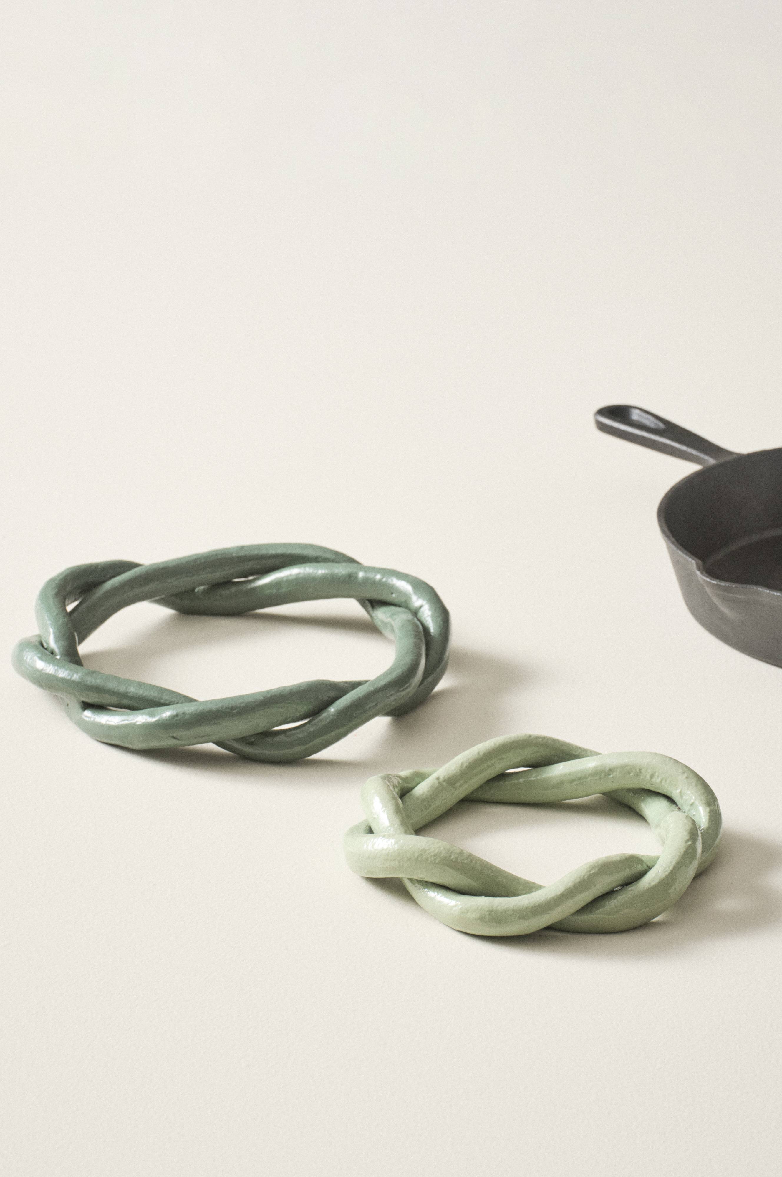 2 podstawki pod garnki wykonane z malowanego aluminium o zabawnym, skręconym kształcie. Zestaw zawiera podstawki w dwóch różnych rozmiarach, jedną jaśniejszą i jedną ciemniejszą.