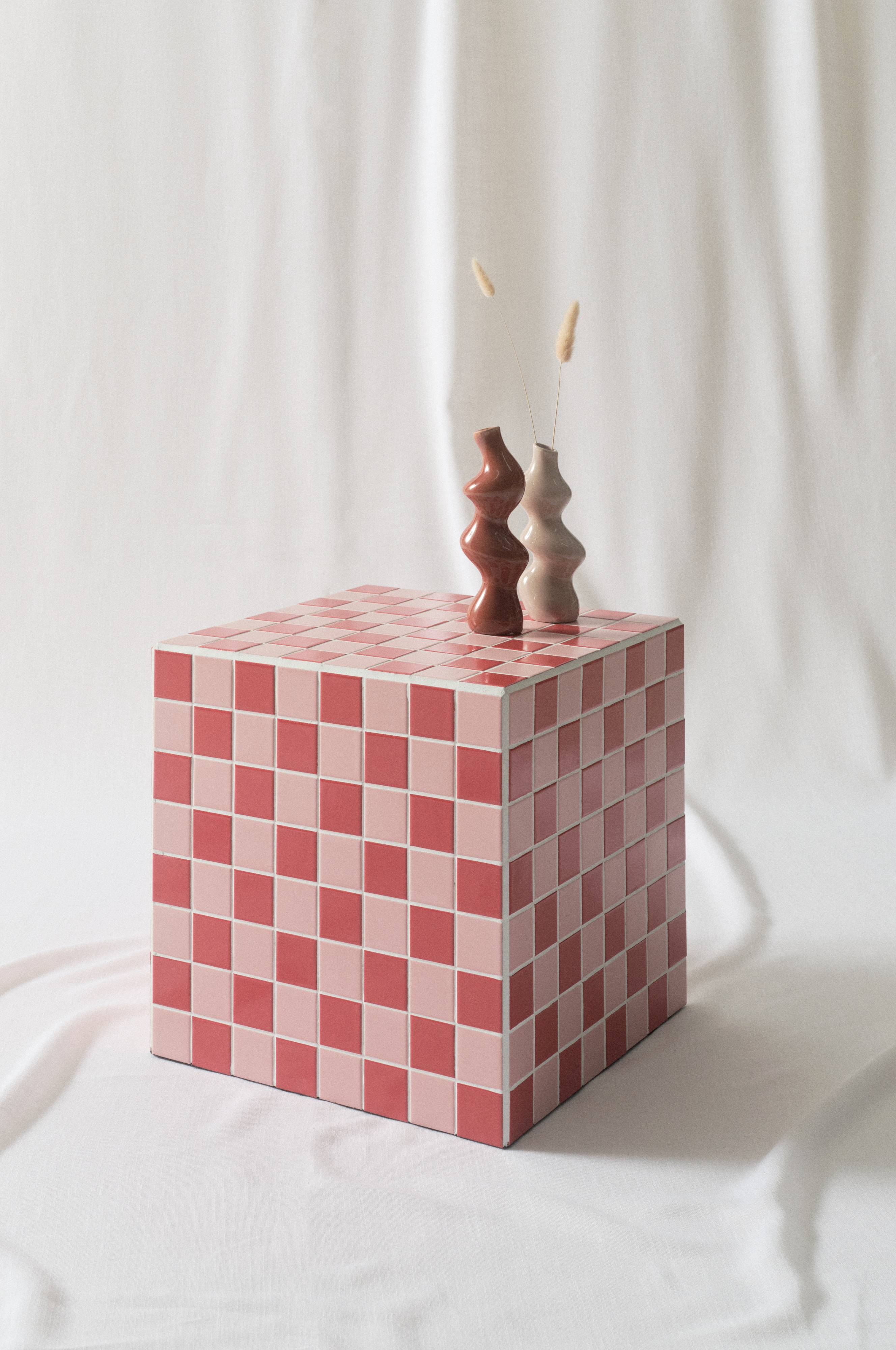 Stolik w kształcie sześcianu w całości pokryty kaflami i komponującą się z nimi fugą. Stelaż wykonany z płyty MDF. Stolik ten to mebel, który ma wiele zastosowań, można ustawić go obok sofy lub w jasnym kąciku, gdzie posłuży jako stojak dla roślin. Uruchom swoją kreatywną stronę i pozbądź się ograniczeń urządzając swoje wnętrza, odmiana stylizacji za pomocą niewielkich mebli, które łatwo można przenosić to prawdziwa rozkosz.