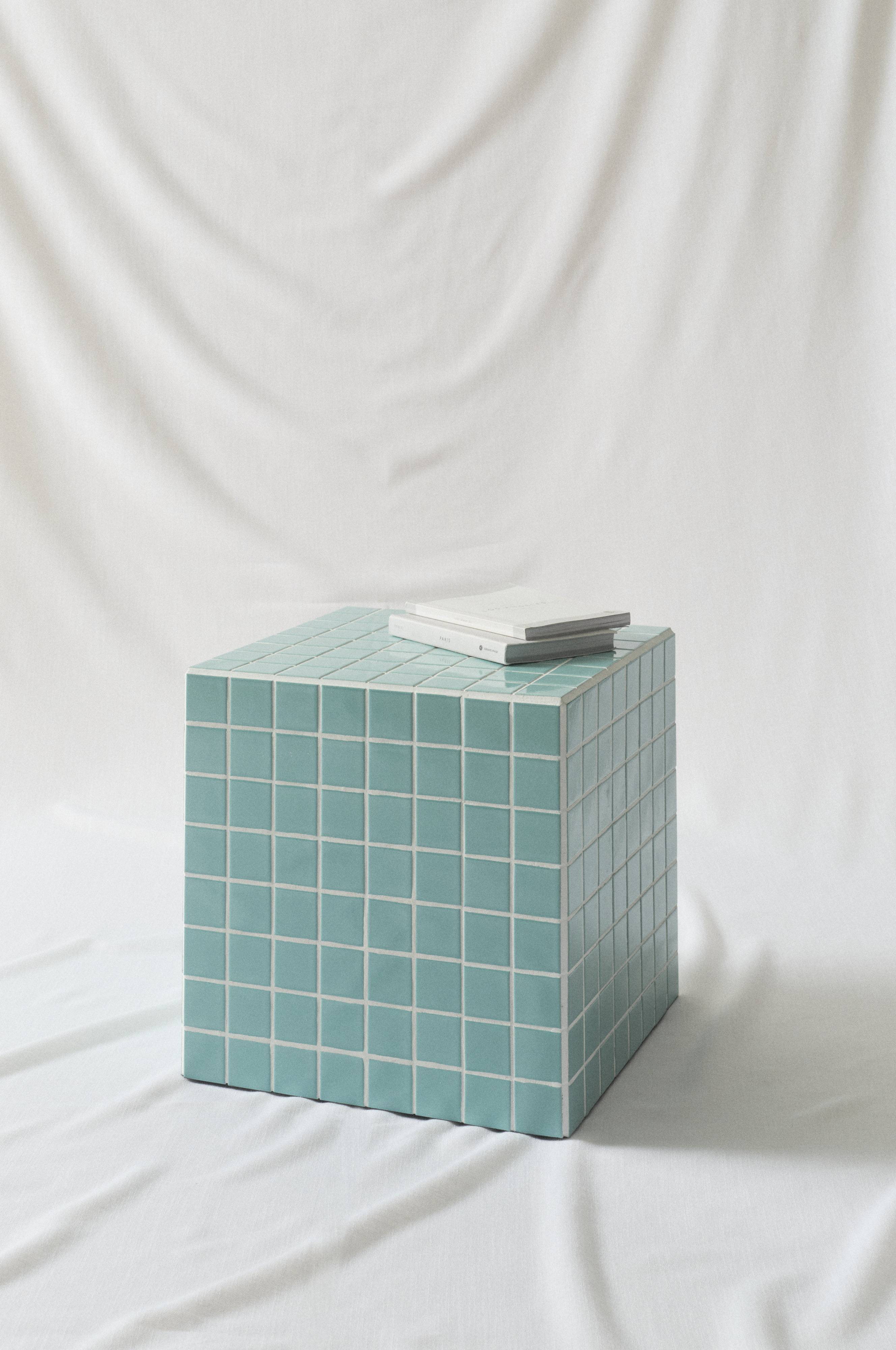 Stolik w kształcie sześcianu w całości pokryty kaflami i komponującą się z nimi fugą. Stelaż wykonany z płyty MDF. Stolik ten to mebel, który ma wiele zastosowań, można ustawić go obok sofy lub w jasnym kąciku, gdzie posłuży jako stojak dla roślin. Uruchom swoją kreatywną stronę i pozbądź się ograniczeń urządzając swoje wnętrza, odmiana stylizacji za pomocą niewielkich mebli, które łatwo można przenosić to prawdziwa rozkosz.