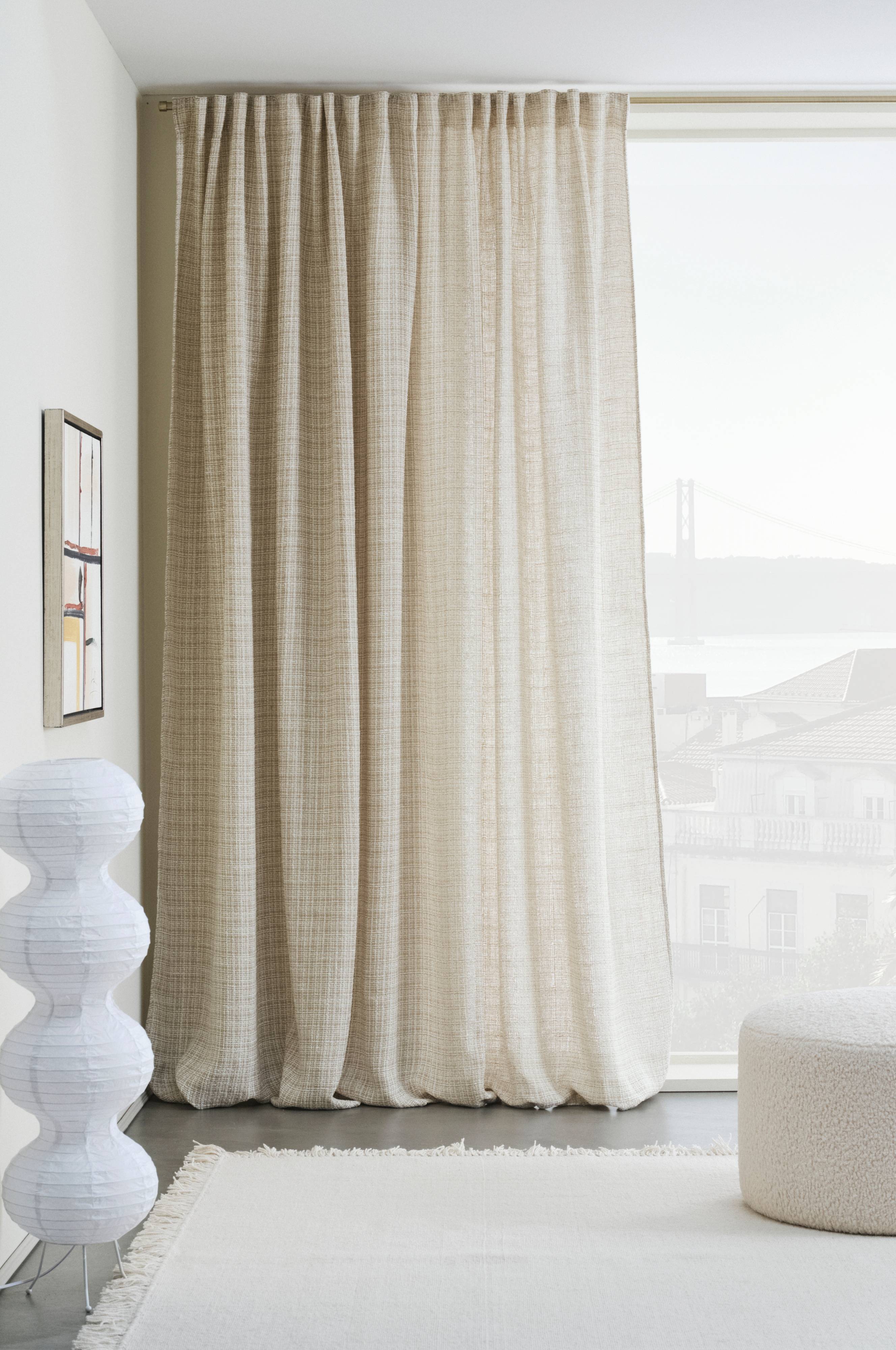 Bardzo szeroka zasłona z pięknej tkaniny, której różnorodne włókna po utkaniu tworzą wzór pełen dynamiki. Z odległości wydaje się, że wzór w nieregularną kratę ma odcień melanżu a sama zasłona jest ciężka i pięknie opada. KIM ma wszytą taśmę wielofunkcyjną, dzięki której można ją zawiesić na haczykach lub przy użyciu tunelu czy krytych szelek. Gramatura tkaniny 260 g/m²