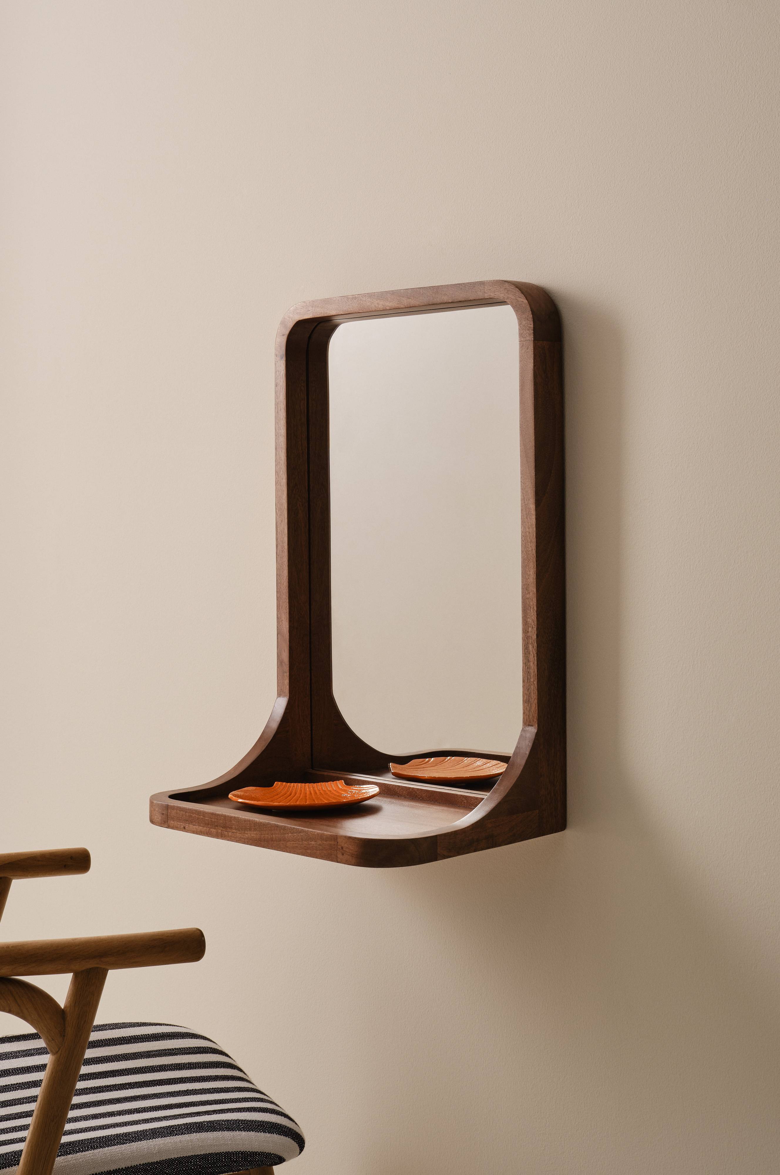 Lustro ścienne KLINTEN łączy piękno z funkcjonalnością. Rama z drewna mango z zaokrąglonymi krawędziami dodaje przytulności, a półka oferuje praktyczne miejsce do przechowywania.
