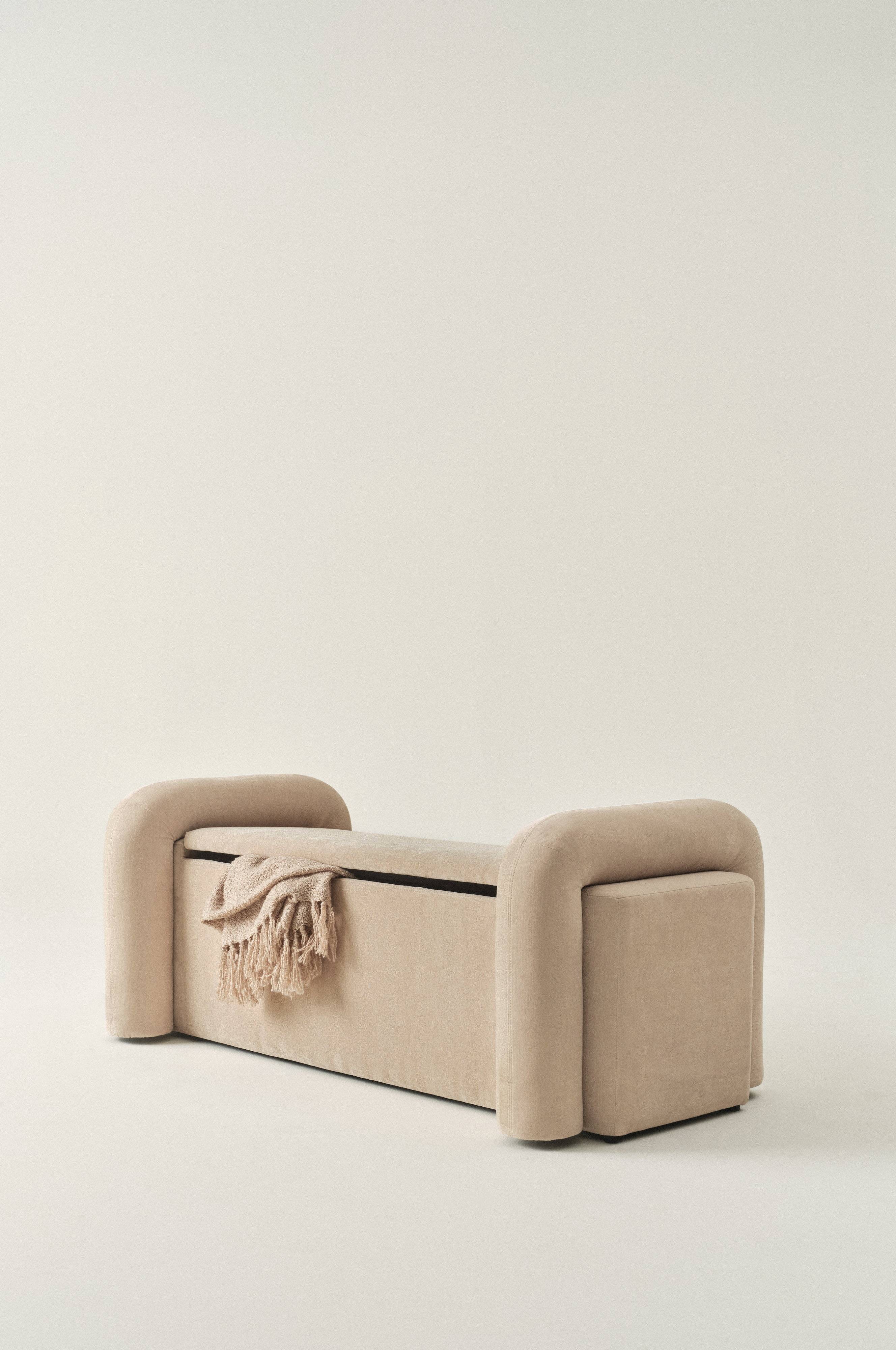 Zachęcająca do wypoczynku ławka z wewnętrzną przestrzenią na przechowywanie, nazywana również skrzynią. Ława ma miękkie wypełnienie i prezentuje się luksusowo. Dla maksymalnej wygody wyściełane są również boki. Przykrywa posiada zawiasy i otwiera się jak skrzynia. Cała ława została pokryta miękką szenilą z poliestru, którego 50% pochodzi z recyklingu. Tkanina szenilowa ma nieregularną strukturę, jest odporna na ścieranie i odznacza się jednocześnie luksusowym wyglądem. Szenila oznacza, że splot tkaniny tworzy wzór na osnowie z przędzy z aksamitu. Wnętrze skrzyni wyścieła tkanina w czarnym kolorze. Rama wykonana jest z drewna sosnowego z certyfikatem FSC i ze sklejki. Wymaga częściowego montażu. Do produktu dołączona jest instrukcja montażu.
