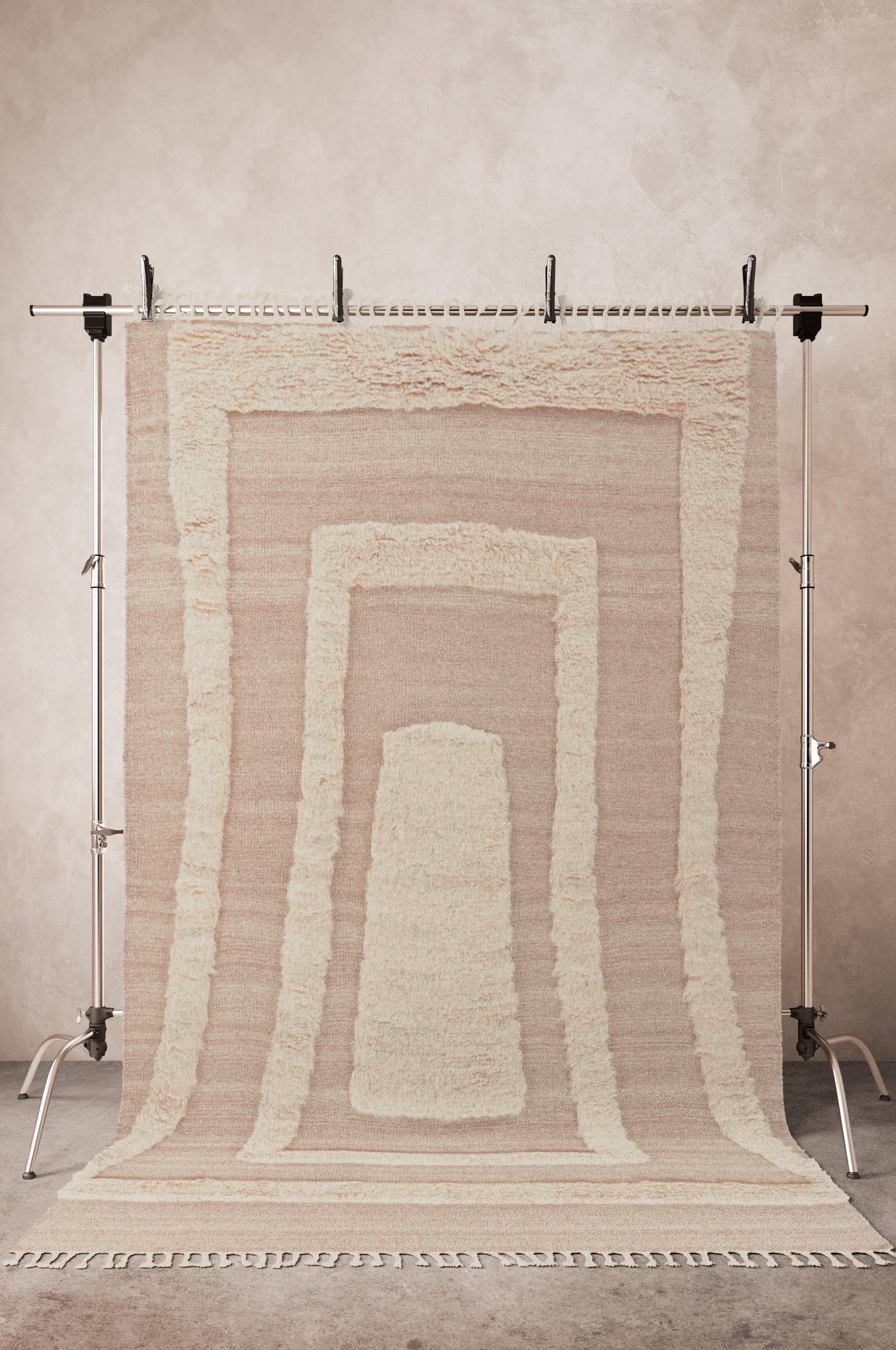 Ręcznie pleciony dywan wełniany z tkanym na płasko podkładem i wzorem z wiązanego włosia. Wzdłuż krótszych boków dywanu biegną wspaniałe, plecione frędzle. Wełna jest naturalnym materiałem, ciepłym i pięknym. Ręcznie wykonany dywan to eleganckie rękodzieło, więc każdy egzemplarz jest unikalny. Długość frędzli 7 cm. Długość włosia 2,6 cm. Grubość 2,9 cm. 2200 g/m².