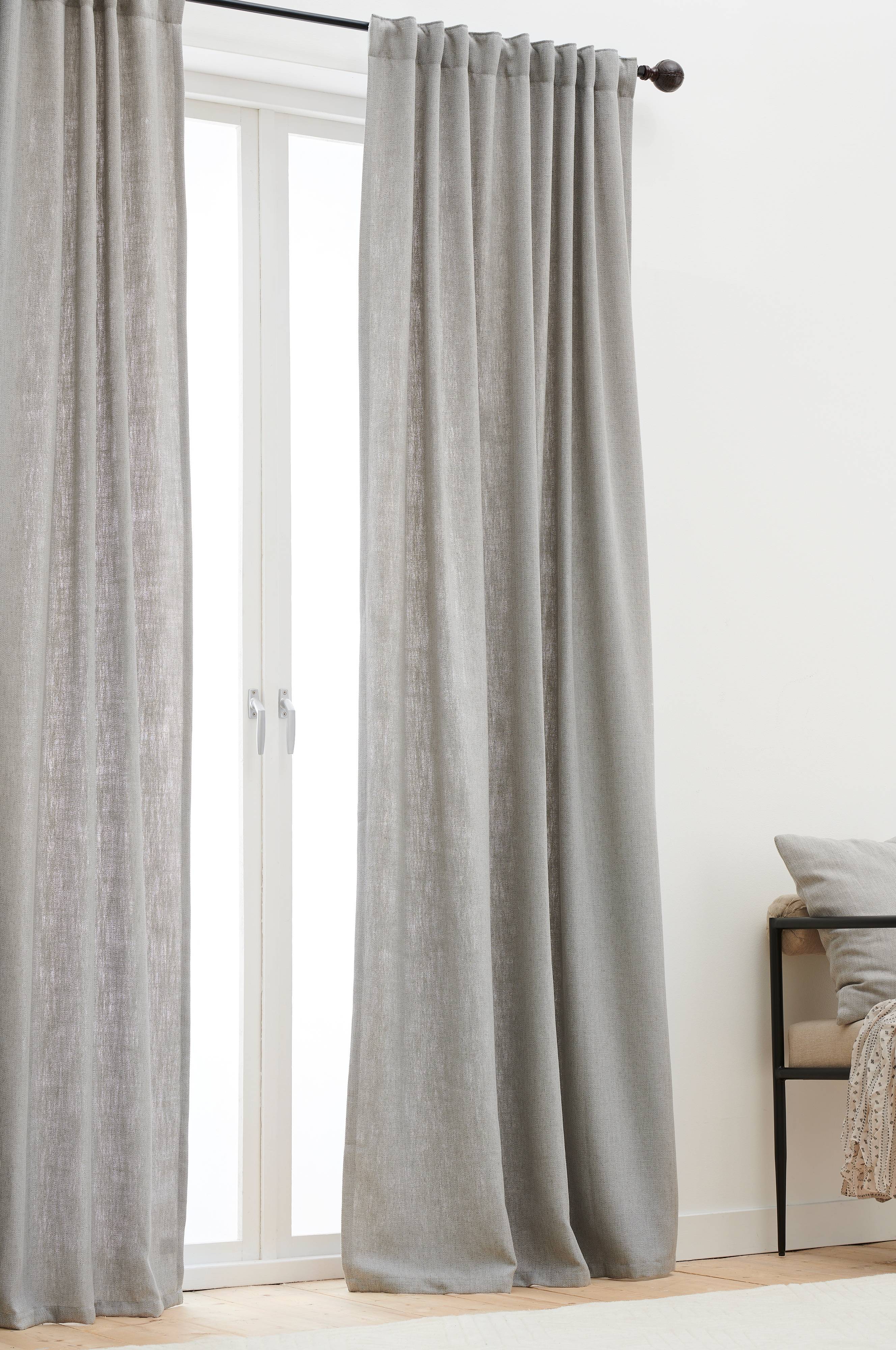 2 jednokolorowe zasłony z mieszanki poliestrowej z wszytą taśmą wielofunkcyjną. Zasłonę można zawiesić na haczykach lub przy użyciu tunelu czy krytych szelek.