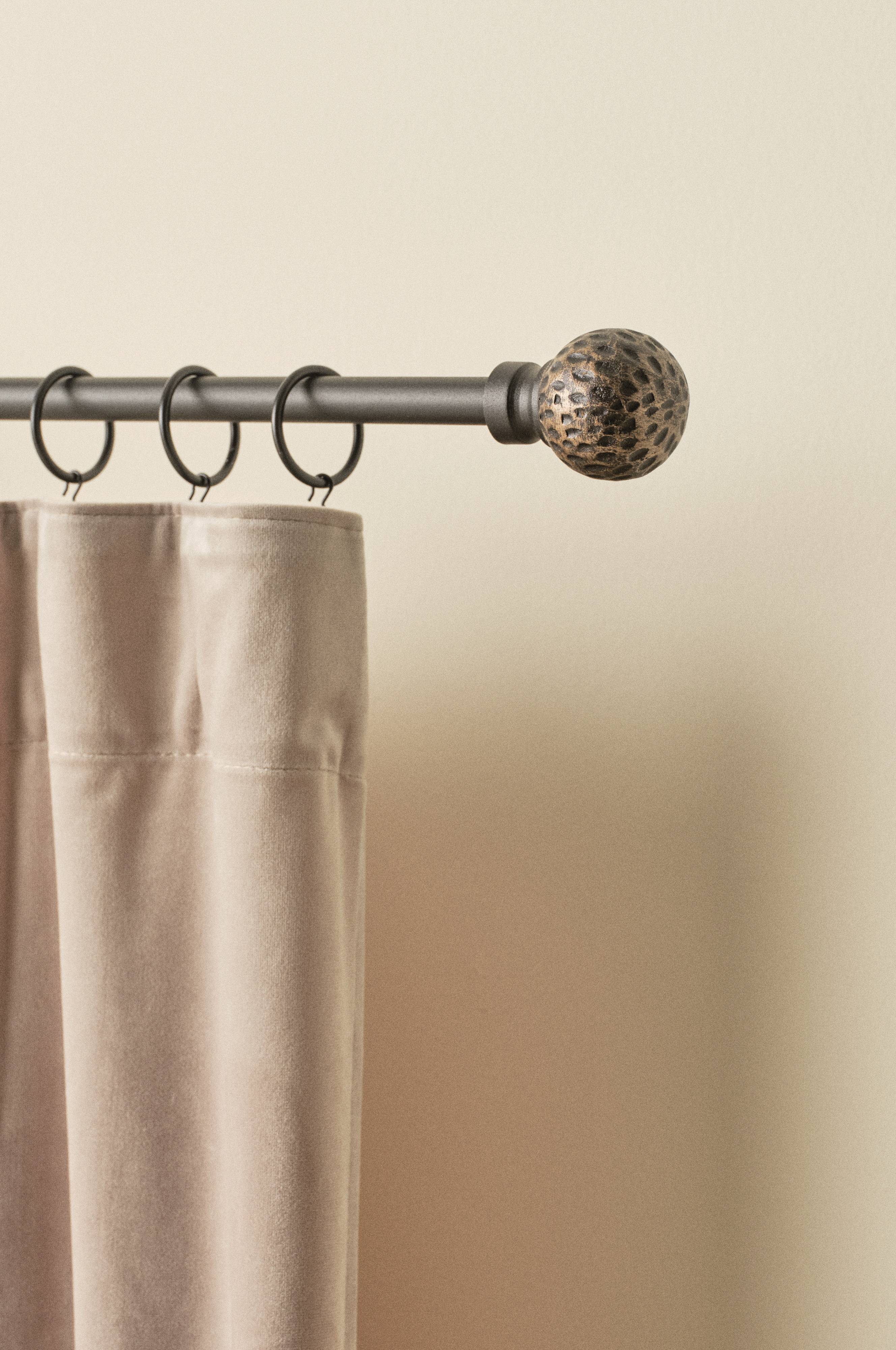 Kompletny zestaw z prętem i gałkami z metalu. Końcówki z kutego metalu. 3 wsporniki, wkręty i kołki w zestawie. Długość całkowita 67-180 cm. Regulacja trzech części, 2 pręty długości 67 cm, ø 16 mm. 1 pręt 67 cm długości, Ø 19 cm.