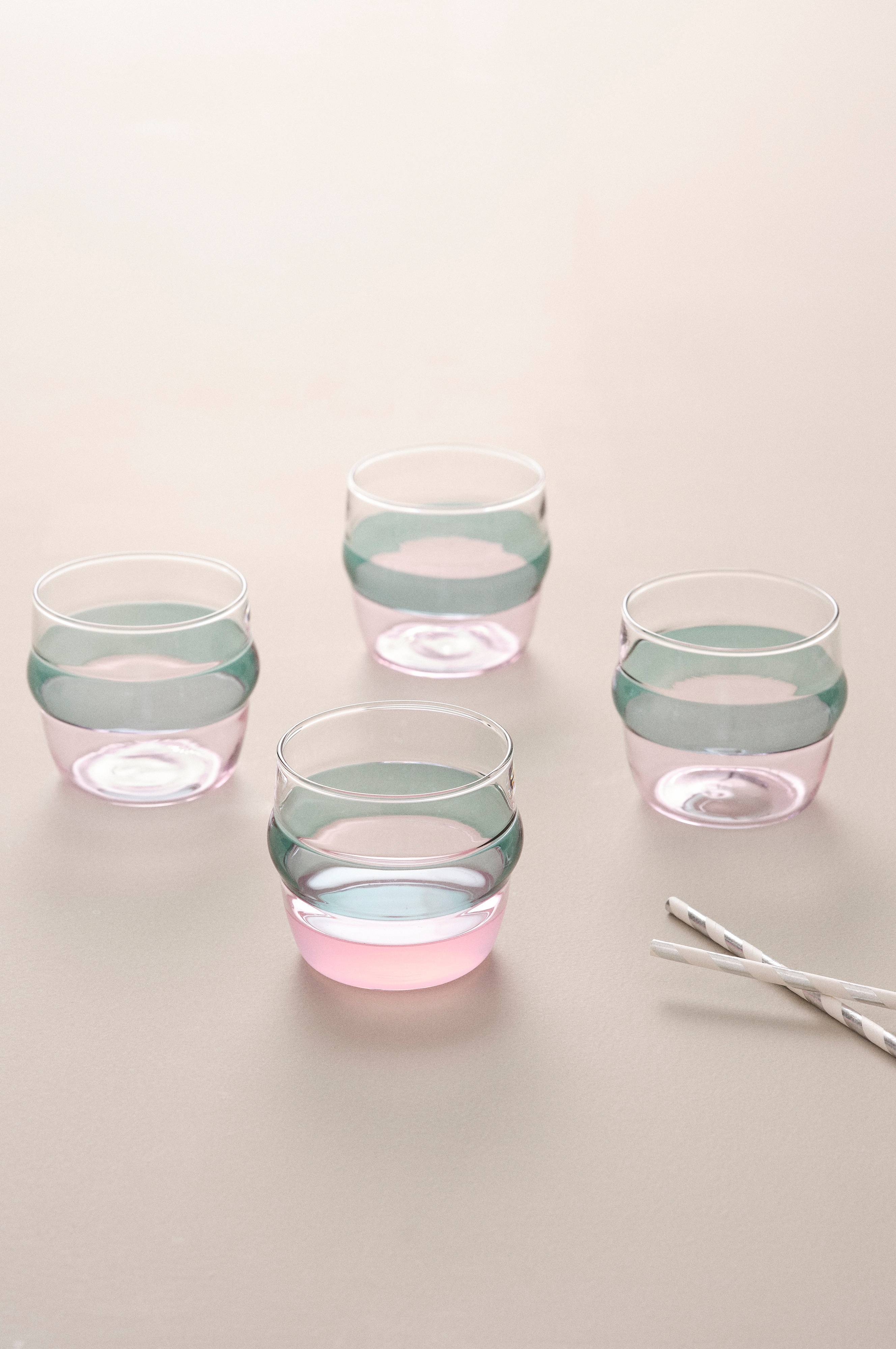 4 szklanki o osobliwej formie, ozdobione po środku kolorowym pierścieniem. Szkło odznacza się lekkim tonem oraz zabawnym kolorem i formą.