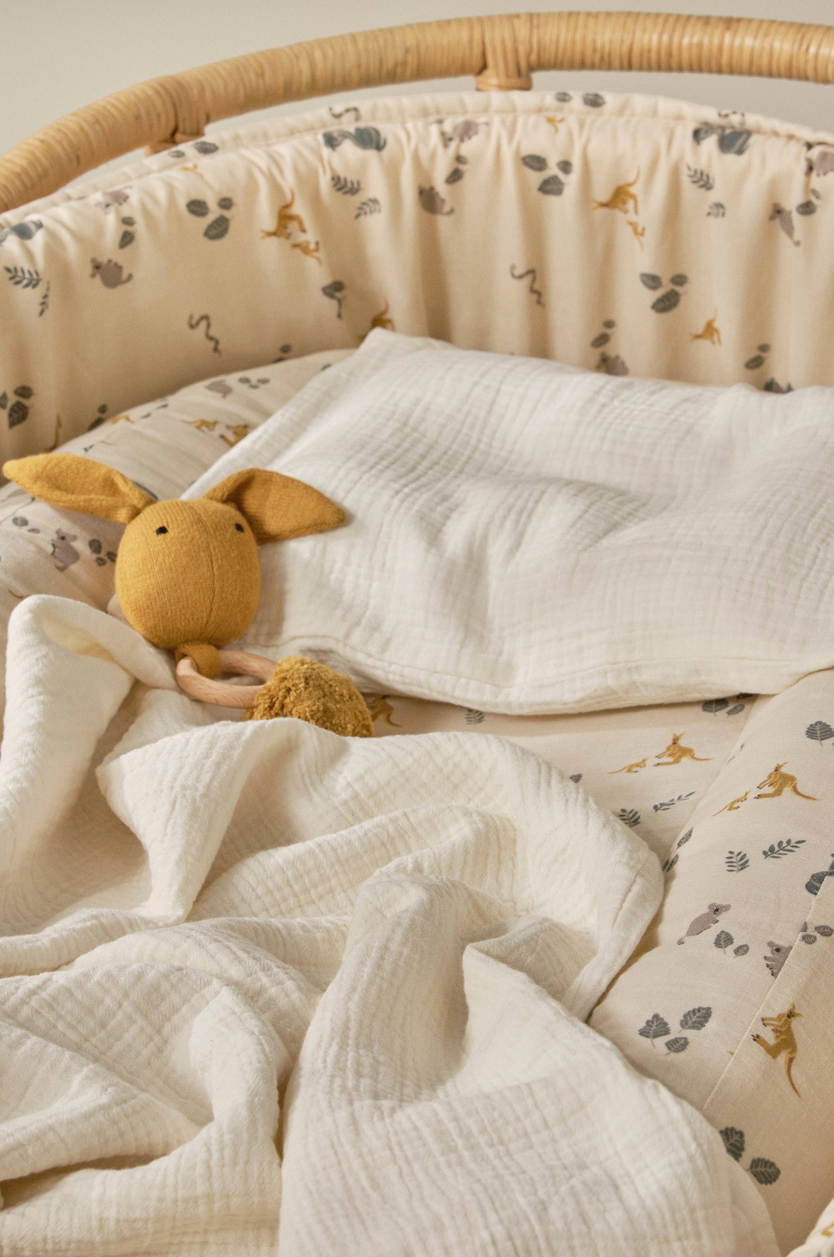Dwuczęściowy komplet pościeli z cudownego, ekologicznego, bawełnianego muślinu. Komplet nadaje się do wózków i kołysek. Muślin jest miękką tkaniną, tkaną w taki sposób, aby powstały niewielkie wybrzuszenia, dzięki którym materiał jest miękki i łatwy w utrzymaniu. Nie wymaga prasowania ani maglowania. W tej wygodnej muślinowej tkaninie będzie się przyjemnie spać. Otwór w górnej krawędzi ułatwi nawleczenie poszwy na kołdrę. Gęstość splotu materiału wynosi 178 TC. (Gęstość splotu materiału oznacza ilość przeplecionych ze sobą nici, thread count, na cal kwadratowy materiału. Im wyższa gęstość tym lepsza jakość.)