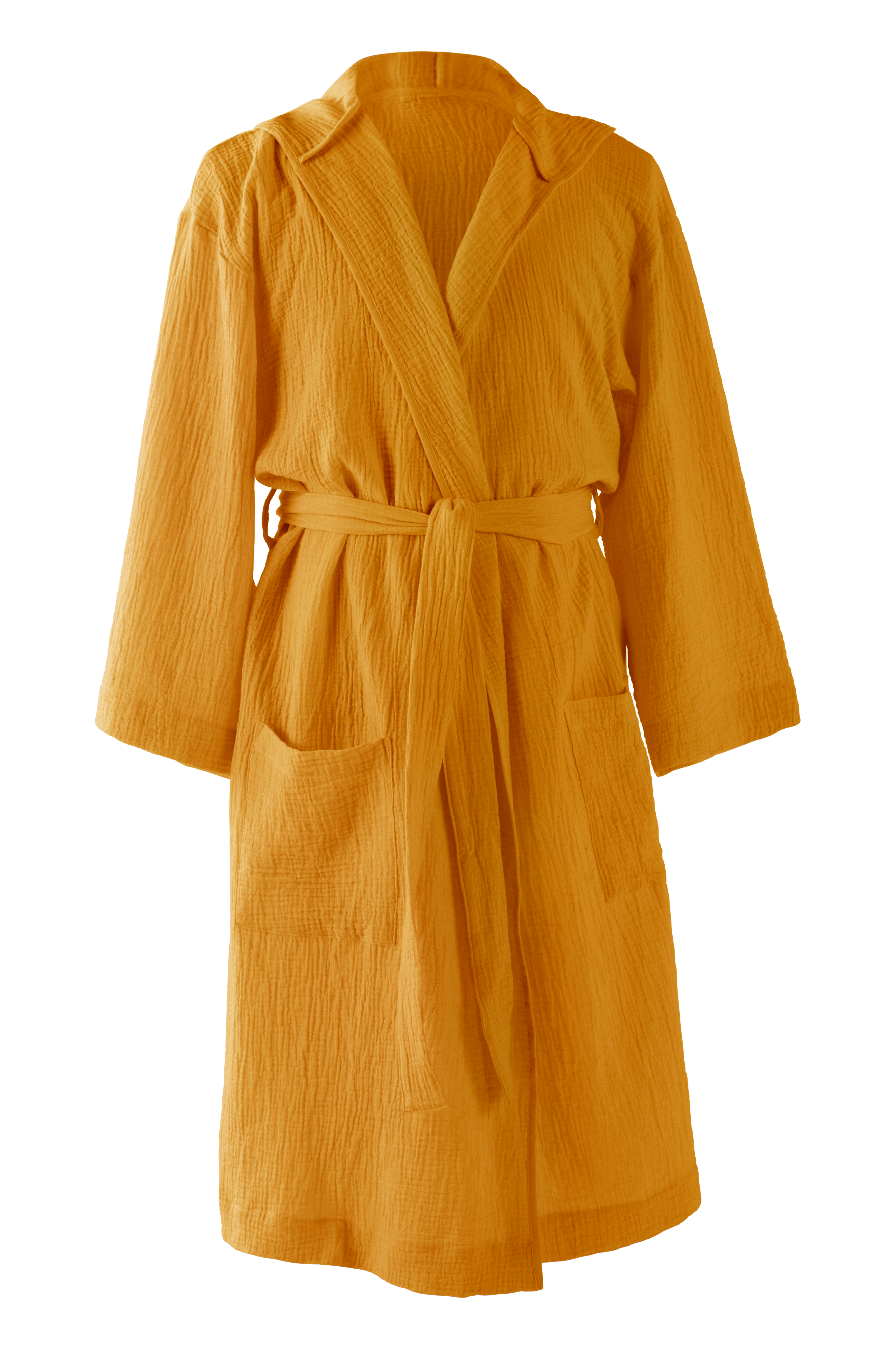 Szlafrok z cudownego, ekologicznego, bawełnianego muślinu. Przytulny szlafrok z kapturem, dwiema przednimi kieszeniami i paskiem wiązanym w talii. Muślin jest miękką tkaniną tkaną w taki sposób, aby powstały niewielkie wybrzuszenia, dzięki którym materiał jest miękki i łatwy w utrzymaniu. Nie wymaga prasowania ani maglowania. Cudowna tkanina muślinowa jest miękka i przyjemna dla skóry.