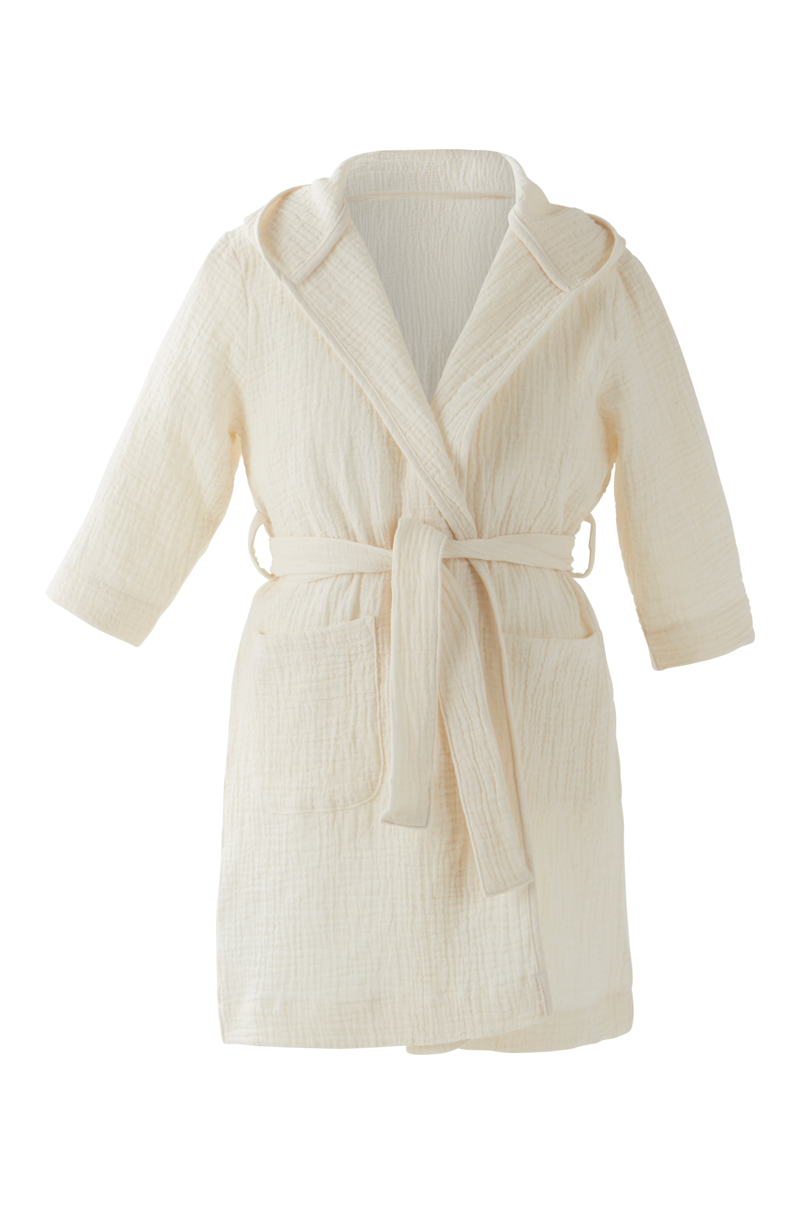 Szlafrok z cudownego, ekologicznego, bawełnianego muślinu. Przytulny szlafrok z kapturem, dwiema przednimi kieszeniami i paskiem wiązanym w talii. Muślin jest miękką tkaniną tkaną w taki sposób, aby powstały niewielkie wybrzuszenia, dzięki którym materiał jest miękki i łatwy w utrzymaniu. Nie wymaga prasowania ani maglowania. Cudowna tkanina muślinowa jest miękka i przyjemna dla skóry dziecka.