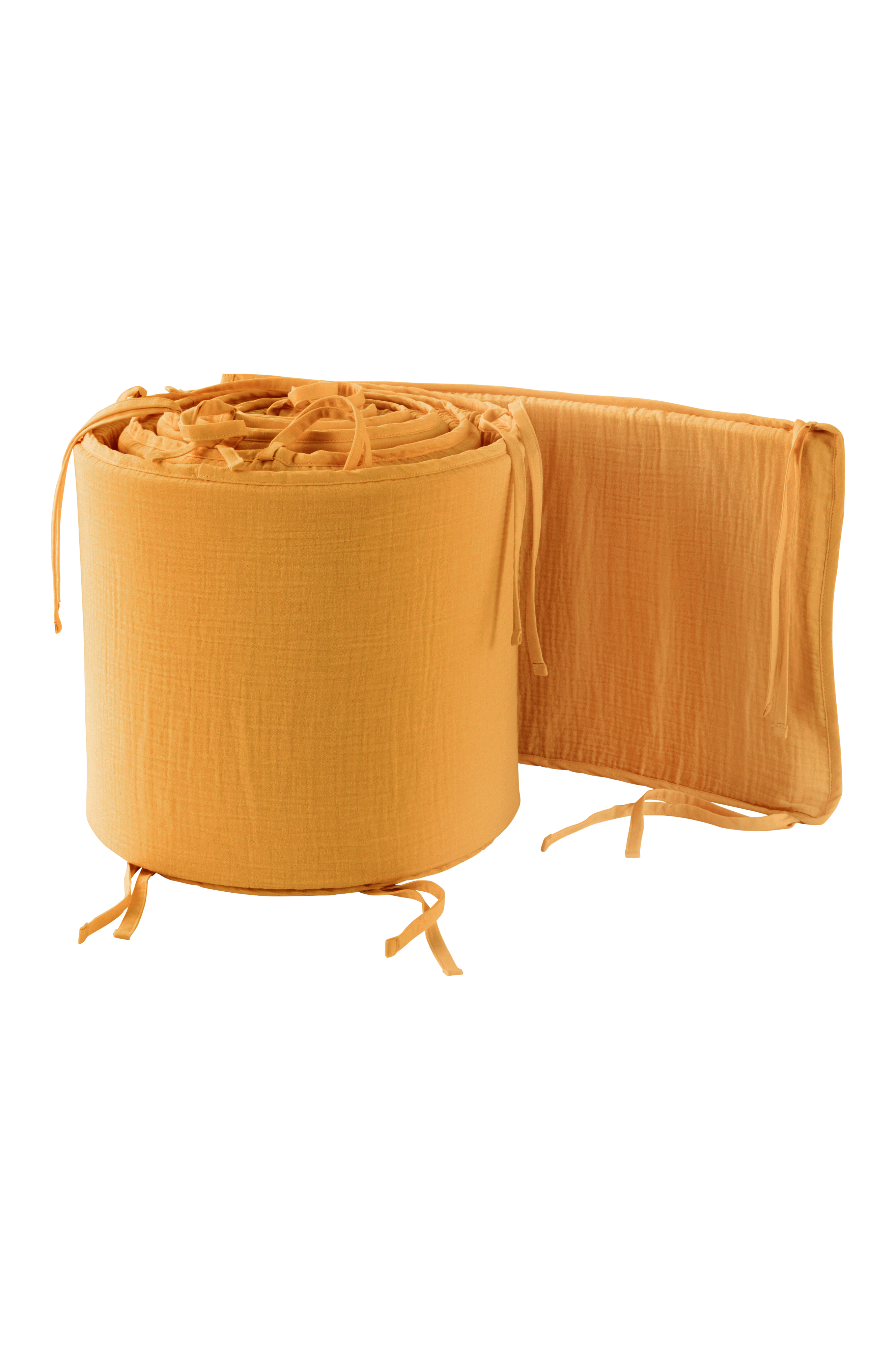 Jednokolorowy ochraniacz do łóżeczka z pokryciem z cudownego, ekologicznego, bawełnianego muślinu. Muślin jest miękką tkaniną tkaną w taki sposób, aby powstały niewielkie wybrzuszenia, dzięki którym materiał jest miękki i łatwy w utrzymaniu. Nie wymaga prasowania ani maglowania. Cudowna tkanina muślinowa jest miękka i przyjemna dla skóry dziecka. Wypełnienie z poliestru z miękkim jądrem z pianki. Ochraniacz sprawia, że łóżeczko jest przyjemne i bardziej przytulne, a jednocześnie chroni dziecko przed uderzeniem się o szczebelki podczas snu. Mocowanie ochraniacza za pomocą troczków. Materiał wierzchni można zdejmować dzięki zamkowi błyskawicznemu i prać.