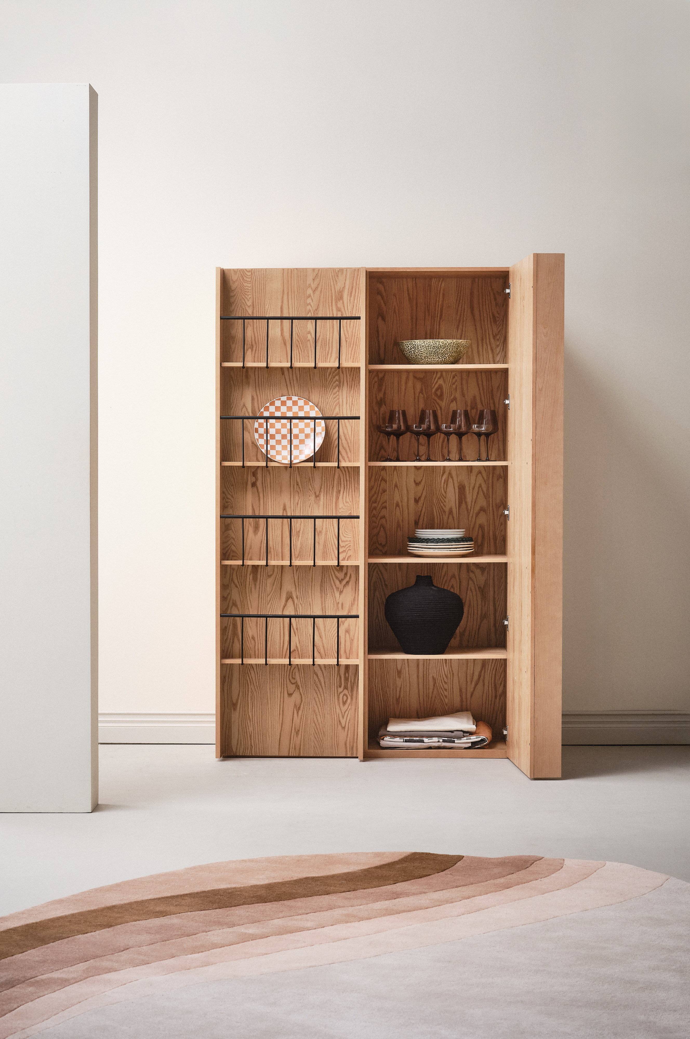 LILJEMOLN to duża i okazała szafka wykonana z płyty MDF pokrytej fornirem z jesionu. Szafka ma podwójne drzwi wyposażone w zewnętrzne półki, na których można wyeksponować każdy produkt, poczynając od eleganckiej butelki z oliwą z oliwek po puszki ze smakołykami. Drzwi mają zawiasy z funkcją cichego zamykania. Wewnątrz szafka jest podzielona na dwie komory, każda schowana za drzwiczkami, w każdej znajdują się cztery półki zamontowane na stałe. Powierzchnię szafki pomalowano lakierem na bazie wody. Na tylnej ściance znajduje się mocowanie do ściany. Wymaga częściowego montażu. Do produktu dołączona jest instrukcja montażu.
