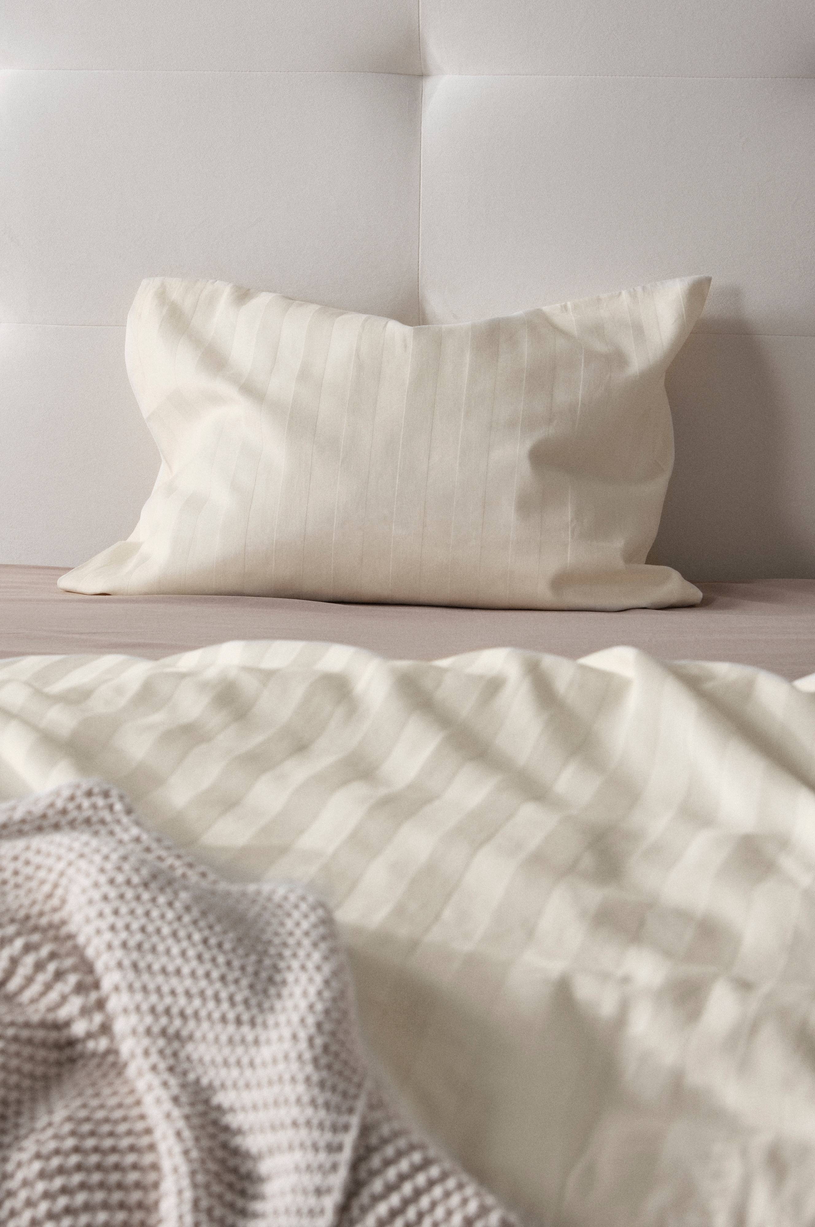 Gładka poszewka z bawełnianej satyny ozdobiona tkanym wzorem w paski w podobnych odcieniach. Satyna to splot tkacki, który tworzy cudownie gładką, miękką i delikatną tkaninę. Bawełna, którą wykorzystuje się w procesie tkania, tworzy materiał o wspaniałym połysku i luksusowym charakterze. Pościel z satyny to doskonały wybór dla tych, którzy pragną zasypiać w luksusie, tak jak w hotelu, z tą różnicą, że nie muszą wychodzić z domu! Gęstość splotu materiału wynosi 215 TC. (Gęstość splotu materiału oznacza ilość przeplecionych ze sobą nici, thread count, na cal kwadratowy materiału. Im wyższa gęstość tym lepsza jakość).