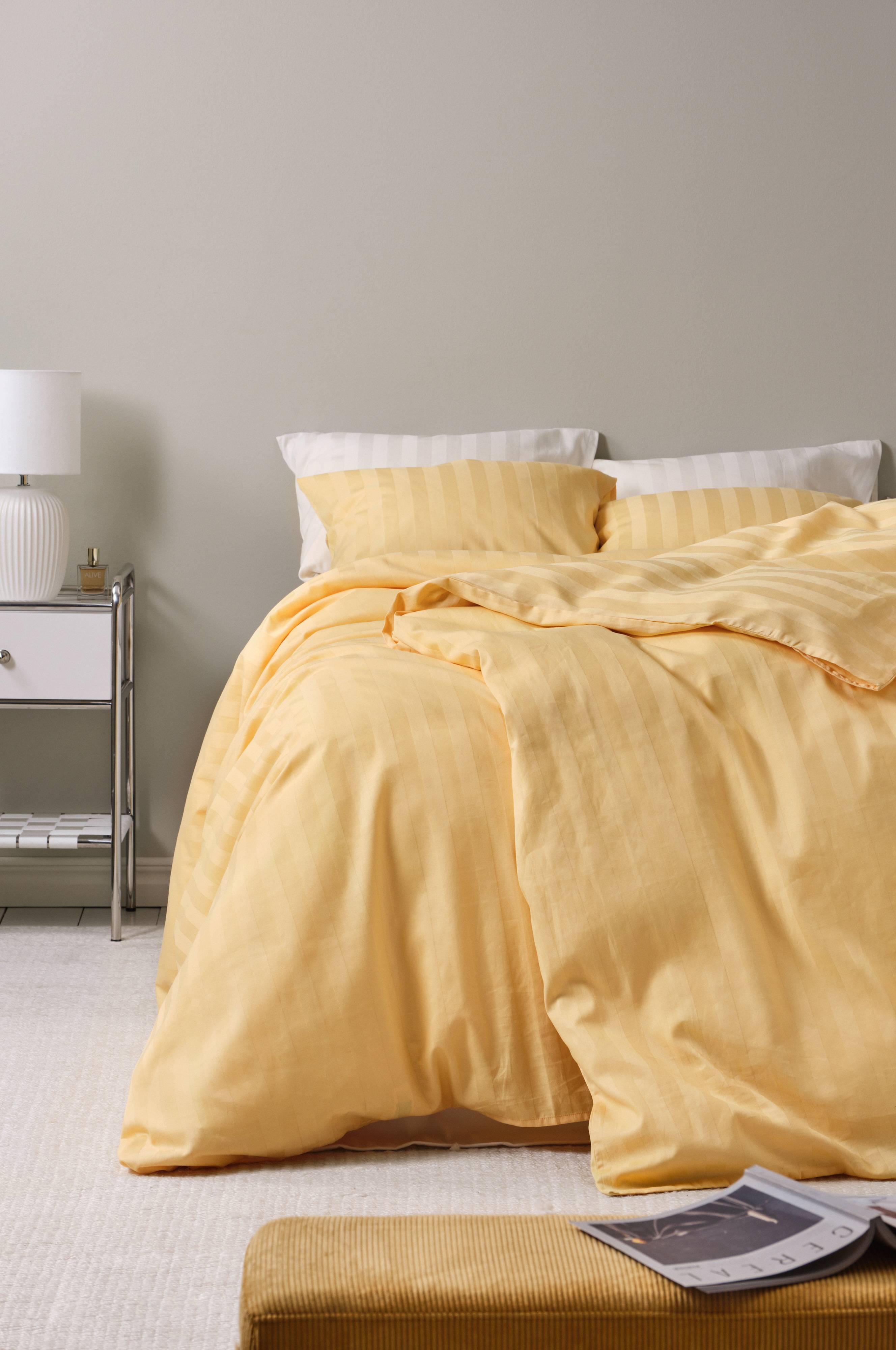 Gładka poszwa z bawełnianej satyny ozdobiona tkanym wzorem w paski w podobnych odcieniach. Satyna to splot tkacki, który tworzy cudownie gładką, miękką i delikatną tkaninę. Bawełna, którą wykorzystuje się w procesie tkania, tworzy materiał o wspaniałym połysku i luksusowym charakterze. Gęstość splotu materiału wynosi 215 TC. Gęstość splotu materiału oznacza ilość przeplecionych ze sobą nici, thread count, na cal kwadratowy materiału. Im wyższa gęstość tym lepsza jakość). Otwór znajduje się w górnej krawędzi poszewki.