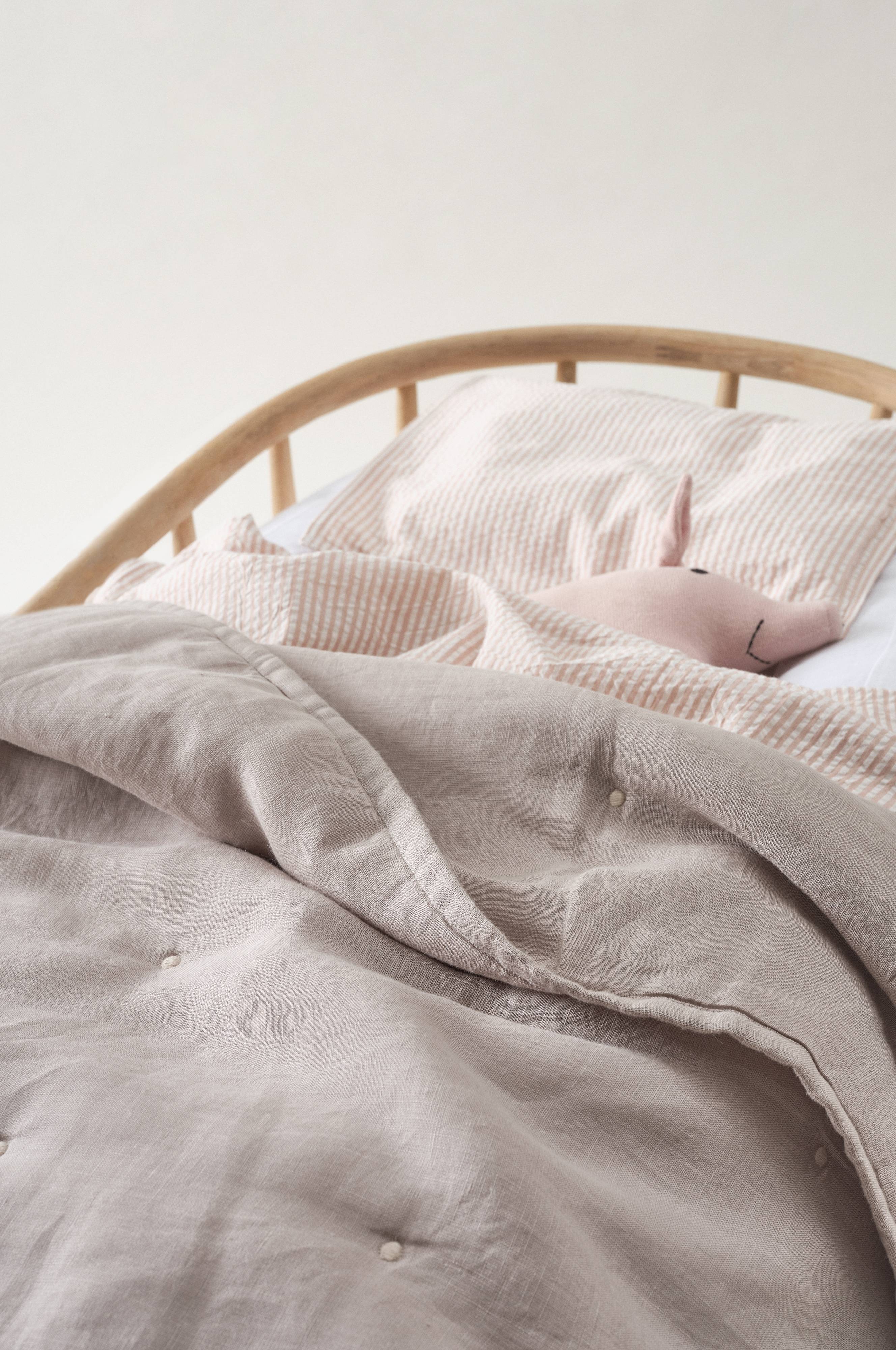 Kocyk dla niemowląt z naturalnego i przyjemnego lnu i wypełnieniem z poliestru. Piękna lniana tkanina została poddana praniu przemysłowemu, aby nadać jej cudowną miękkość i dodać urody. Na kocyku wyhaftowano wzór kropek, a całość wykończono przeszytym brzegiem. Wypełnienie czyni kocyk ciepłym i przyjemnym. Kocyk świetnie nadaje się do owinięcia dziecka, gdy trzymasz je w ramionach, do okrycia malucha w łóżeczku lub do rozłożenia na podłodze, aby dziecko mogło trochę poleżeć na brzuchu i ćwiczyć szyję. Waga 160 g/m².