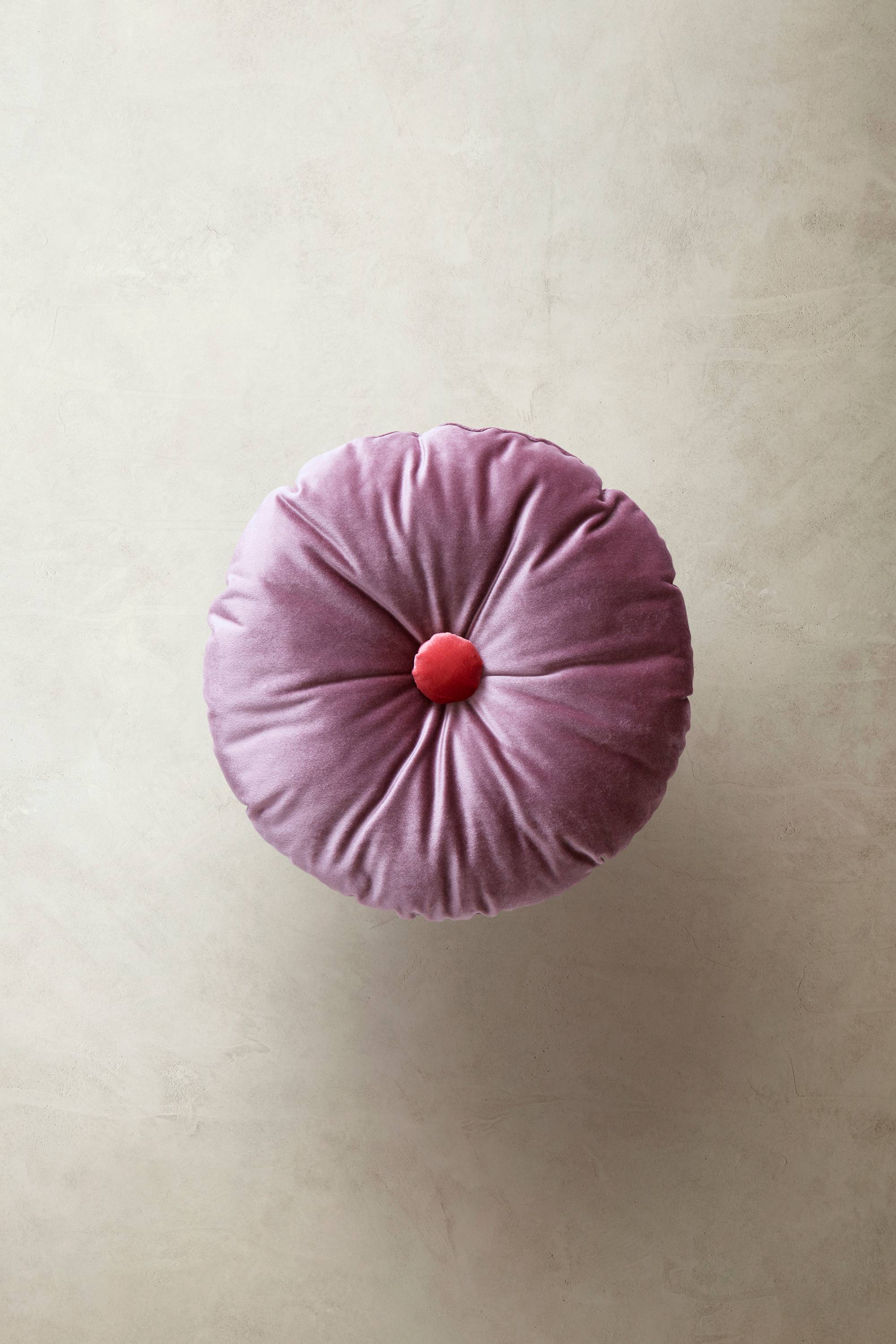 1 okrągła poduszka z aksamitu z dużym guzikiem obitym aksamitem naszytym po obu stronach poduszki. Poduszka wypchana jest miękkim wypełnieniem, występuje w figlarnych kolorach, które można łaczyć ze sobą tworząc wesołe zestawy.