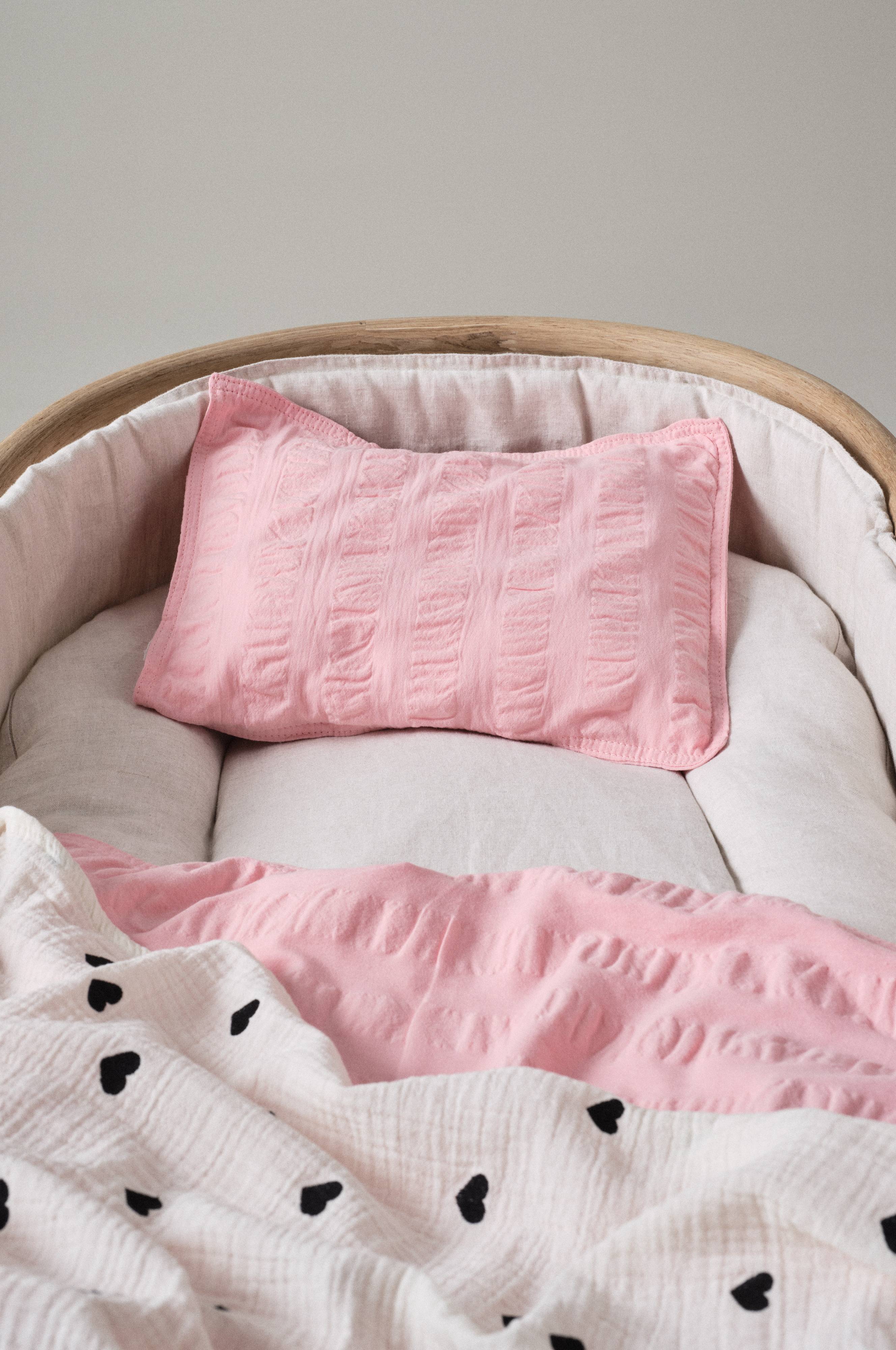 Poszewka na poduszkę wykonana ze ślicznego kreponu z ekologicznej bawełny posiadającej certyfikat. Krepon jest przewiewną tkaniną, która dzięki bąbelkowej strukturze jest lekka i zapewnia przyjemny przepływ powietrza. Seria LOLO jest gładka i jednocześnie ozdobiona wzorem w paski, została wykonana z tkaniny tkanej na płasko, która przeplata się z pasami na kreponie. Tkanina została utkana z barwionej przędzy i poddana praniu dla uzyskania większej miękkości. Ta niewielka poszewka nadaje się doskonale do wózeczka i kołyski. Gęstość splotu materiału wynosi 120 TC. (Gęstość splotu materiału oznacza ilość przeplecionych ze sobą nici, thread count, na cal kwadratowy materiału. Im wyższa gęstość tym lepsza jakość.)
