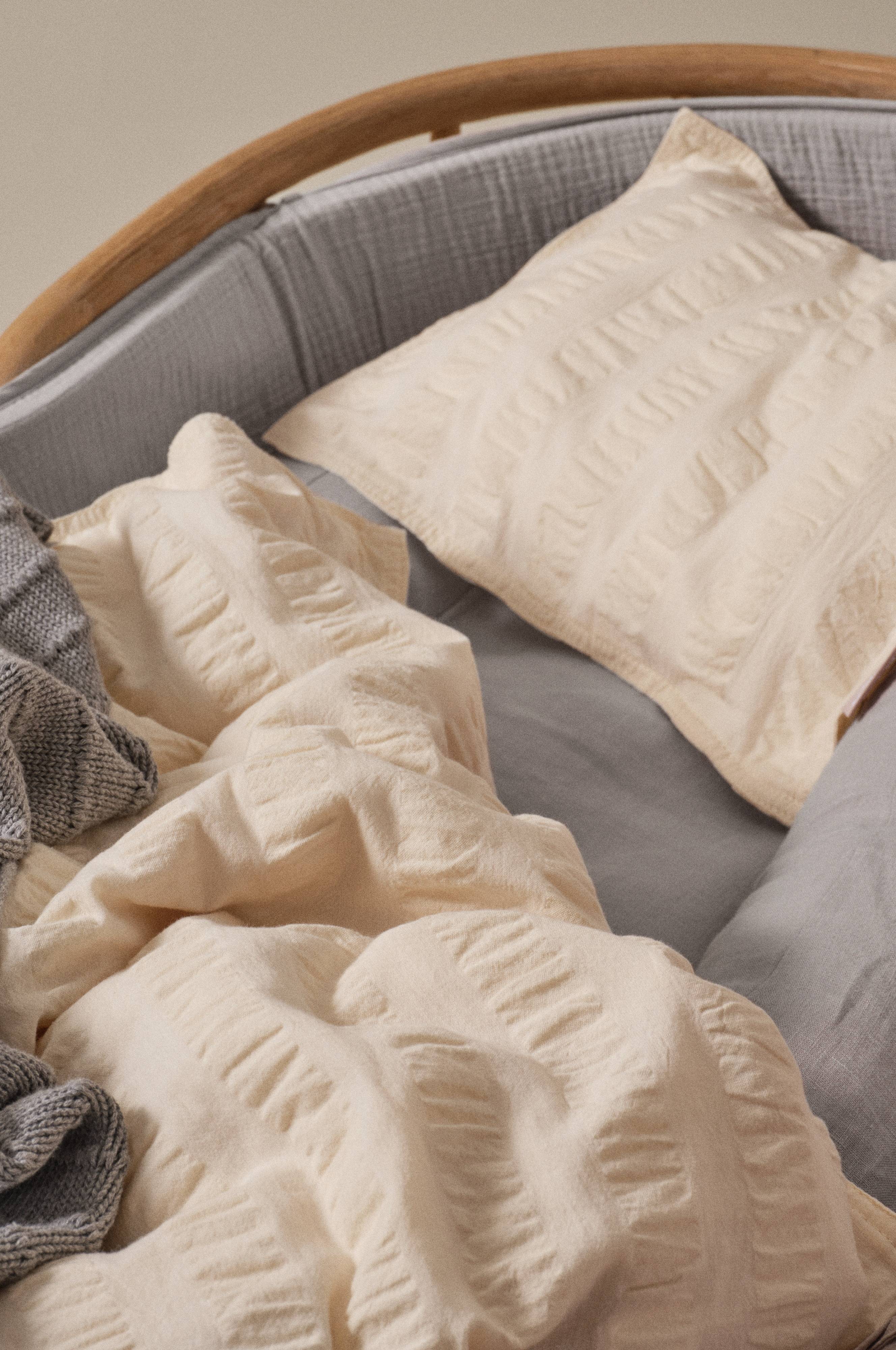 Komplet pościeli składający się z poszwy na kołdrę i poszewki na poduszkę wykonany ze ślicznego kreponu z ekologicznej bawełny posiadającej certyfikat. Komplet doskonale się nadaje do wózków i kołysek. Krepon jest przewiewną tkaniną, która dzięki bąbelkowej strukturze jest lekka i zapewnia przyjemny przepływ powietrza. Seria LOLO jest gładka i jednocześnie ozdobiona wzorem w paski, została wykonana z tkaniny tkanej na płasko, która przeplata się z pasami na kreponie. Tkanina została utkana z barwionej przędzy i poddana praniu dla uzyskania większej miękkości. Gęstość splotu materiału wynosi 120 TC. (Gęstość splotu materiału oznacza ilość przeplecionych ze sobą nici, thread count, na cal kwadratowy materiału. Im wyższa gęstość tym lepsza jakość.)