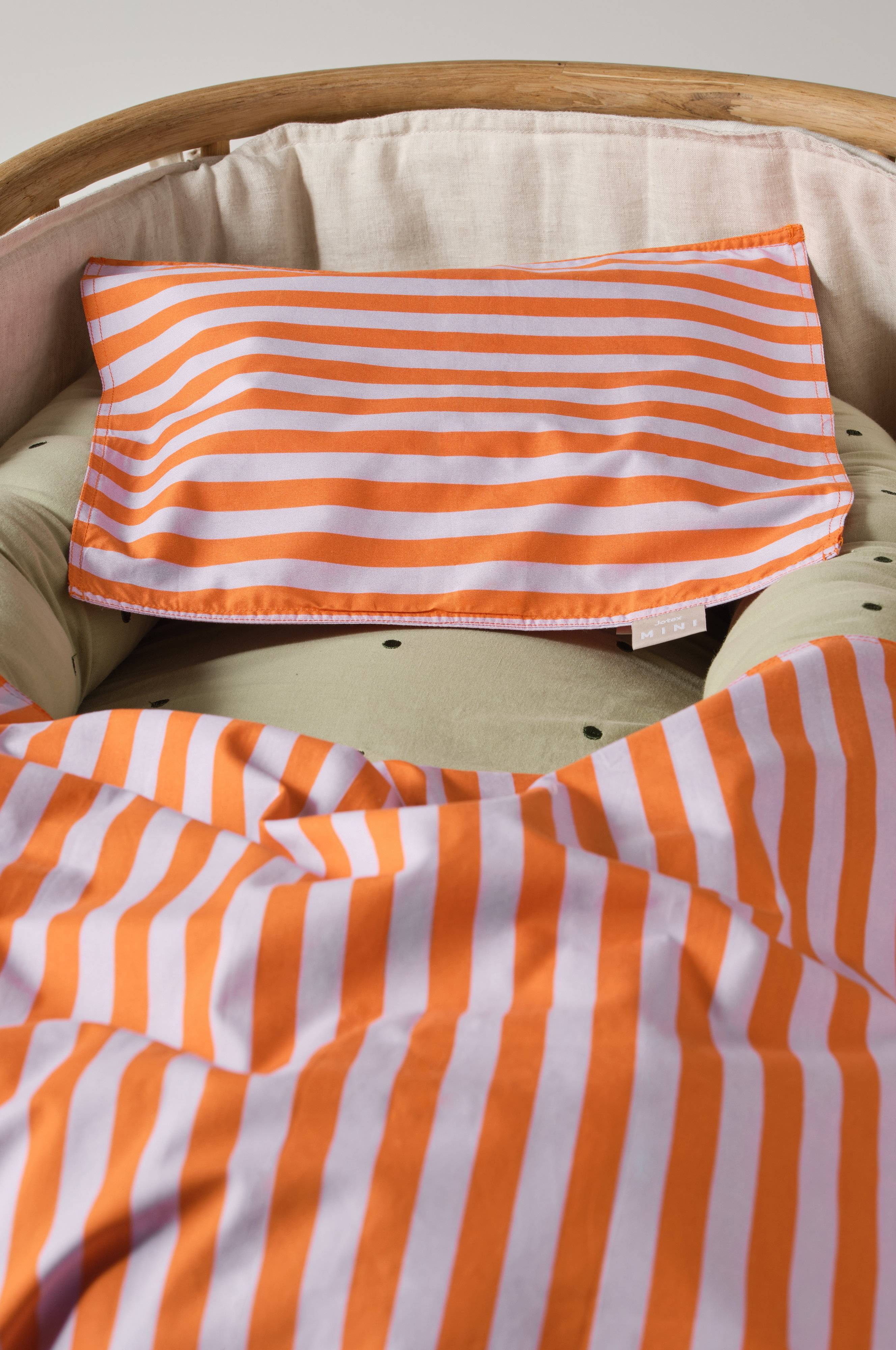 Poszewka na poduszkę z ekologicznej bawełny w pasy. Barwną pościel z kolekcji LOUSA zdobi cyfrowy nadruk w pasy, który jest miękki i wyraźniejszy oraz zapewnia lepsze odwzorowanie kolorów. Ekologiczna bawełna jest przyjemnym materiałem do spania, ponieważ pozostaje chłodna i przyjemna dla skóry. Jest to idealna poszewka, na której niemowlę ułoży główkę podczas snu, a wypranie jednej poszewki jest szybsze i łatwiejsze niż pranie całej pościeli. Gęstość splotu materiału wynosi 180 TC. (Gęstość splotu materiału oznacza ilość przeplecionych ze sobą nici, thread count, na cal kwadratowy materiału. Im wyższa gęstość tym lepsza jakość. Wyjątkiem są tkaniny z lnu, które zazwyczaj mają rzadki splot, co przekłada się na wygodę używania.)