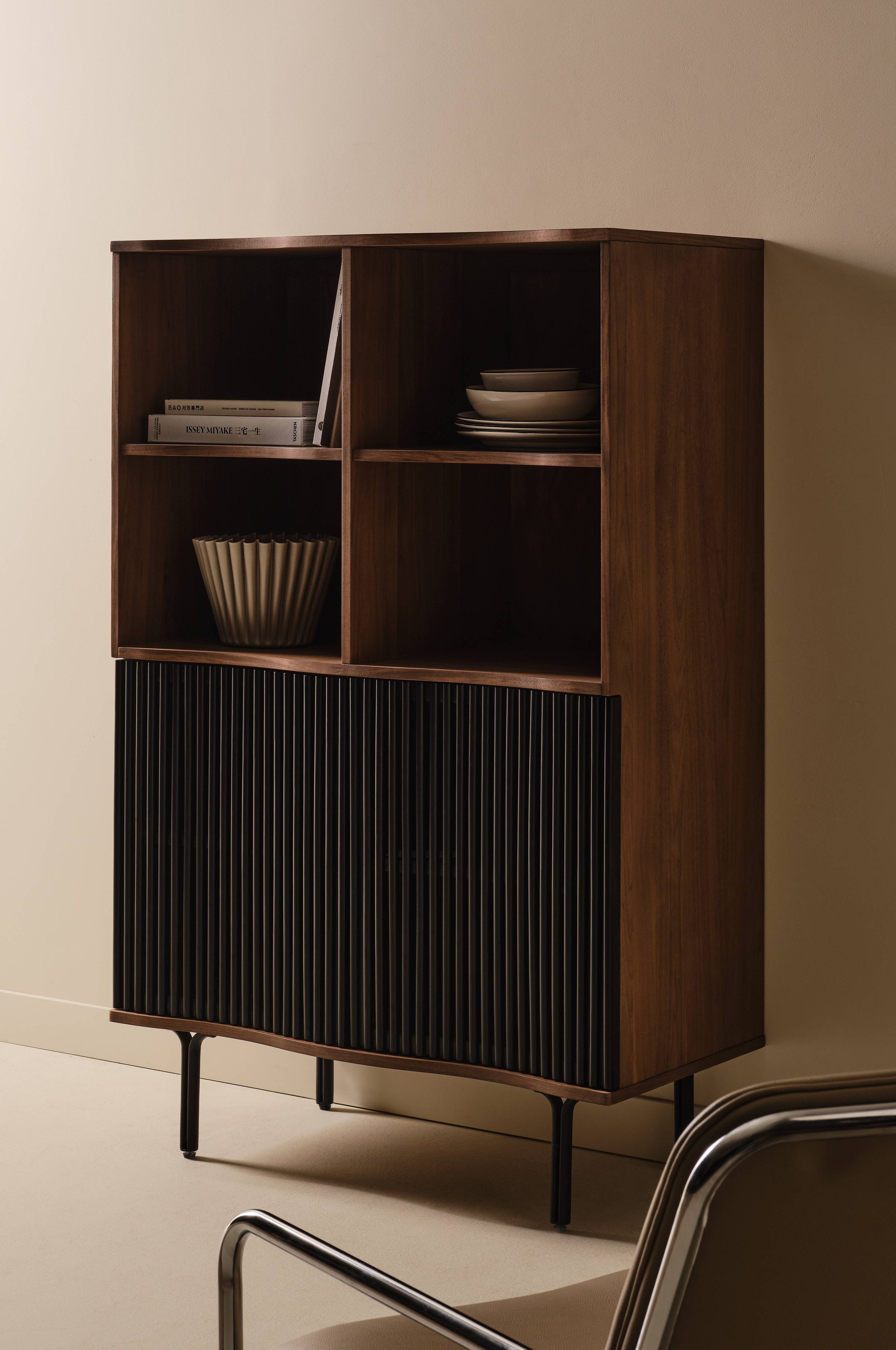 Wysoka szafka LÖVSTRAND oferuje ponadczasowy wygląd dzięki konstrukcji z płyty MDF fornirowanej orzechem i eleganckim metalowym nóżkom. Konstrukcja posiada dwie otwarte półki i ukryte schowki za miękko zamykającymi się drzwiami dla dyskretnej organizacji. Zakrzywione półki dodają odrobinę architektonicznej intrygi, idealnej do nowoczesnego domu. Idealny dla tych, którzy chcą dodać elegancji i inteligentnego przechowywania do swoich wnętrz.