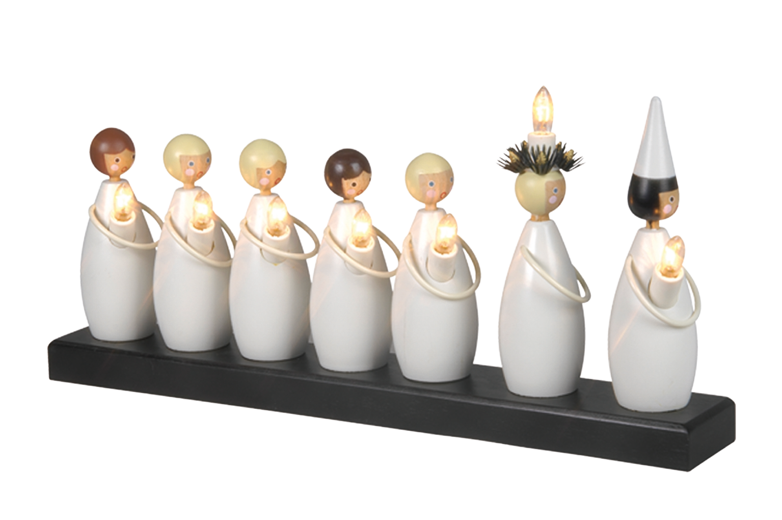 Wymiary: Szerokość 48 cm. Głębokość 7 cm. Wysokość 22 cm. Klasyczny pochód świętej Łucji. 230 V. Przewód o długości 1,8 m.
