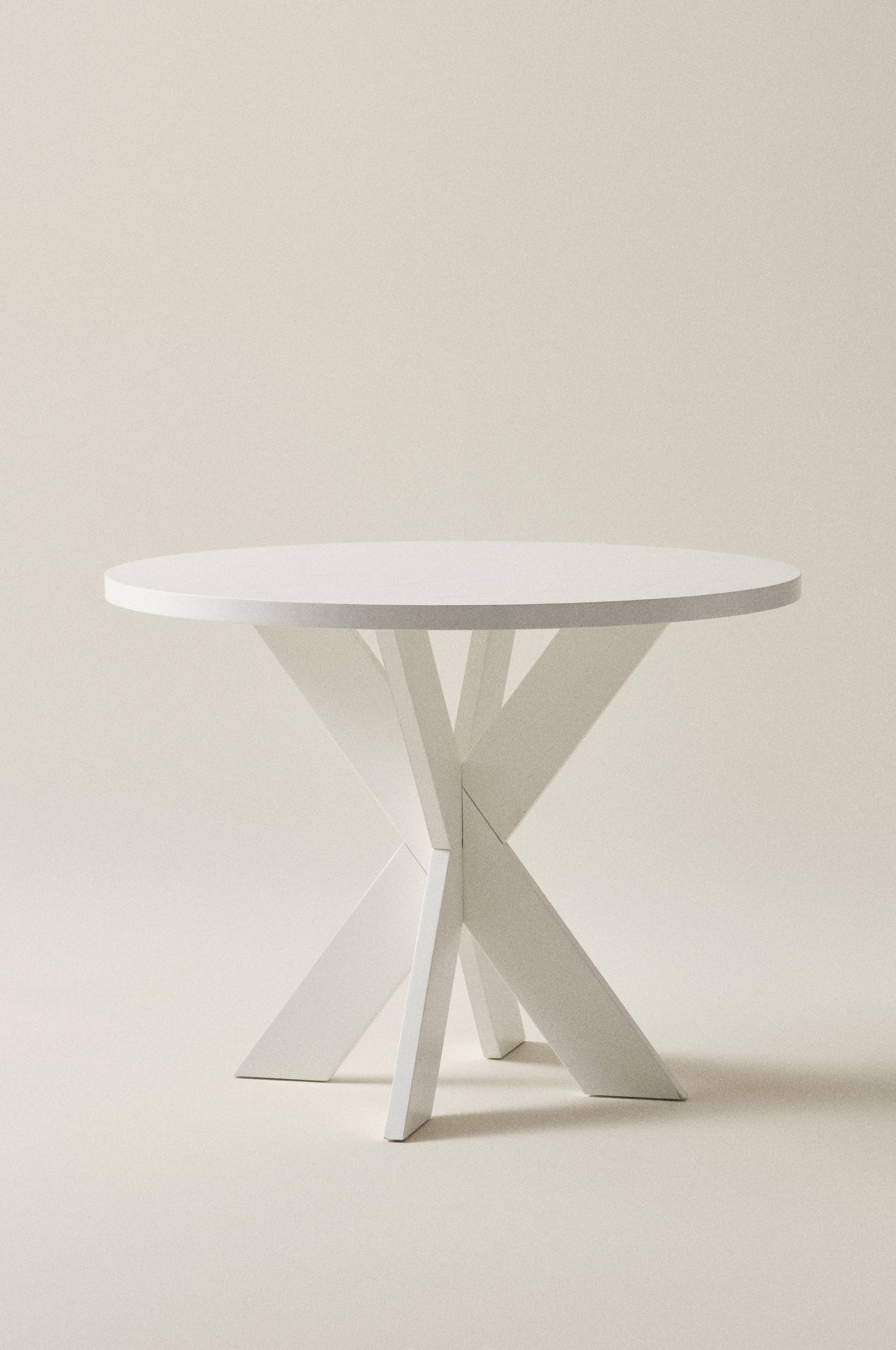 Okrągły stół wykonany z płyty MDF. Elegancki stół oklejony pięknym fornirem pokrytym warstwą matowego lakieru wodnego. Stabilne krzyżowe nogi, stylowe i praktyczne, zapewnią dużo miejsca na nogi. Wymaga częściowego montażu. Do produktu dołączona jest instrukcja montażu.