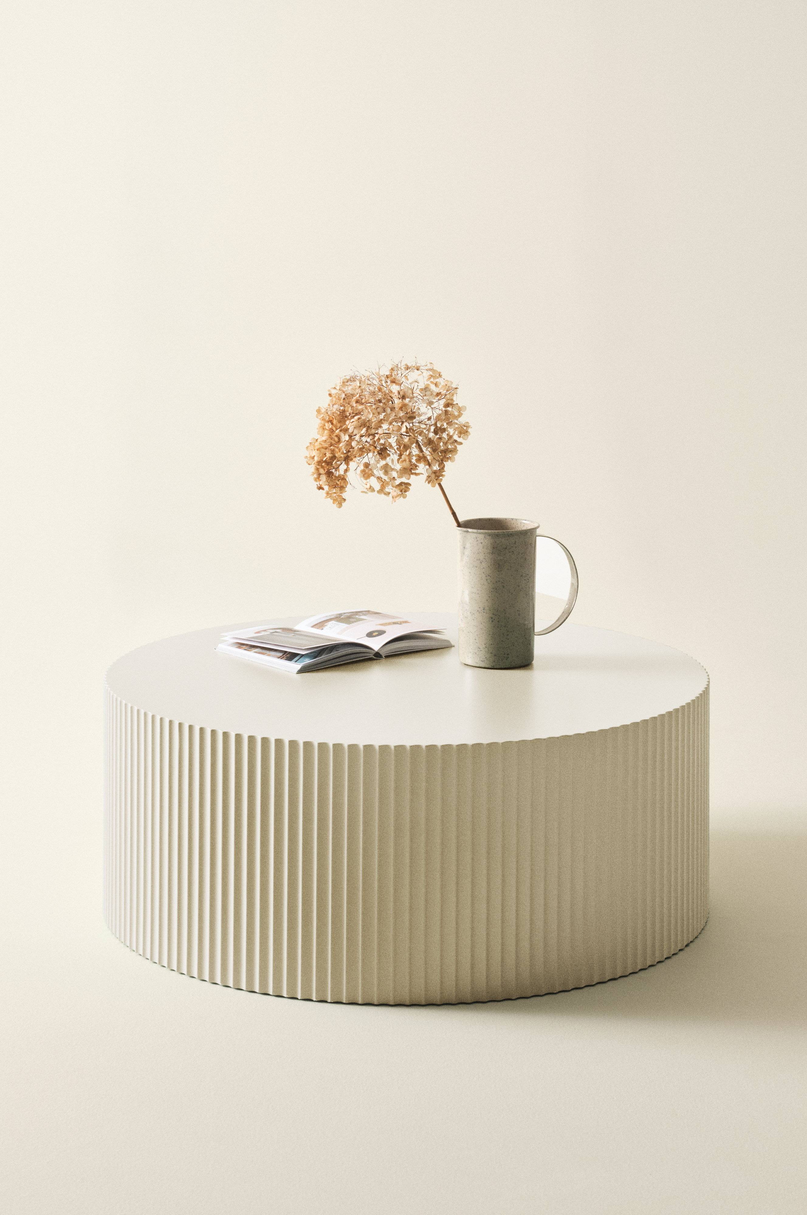 Okrągły stolik z płyty MDF oznaczonej certyfikatem FSC i pokrytej matowym lakierem. Gładki blat stolika odznacza się na tle żebrowanych boków.
