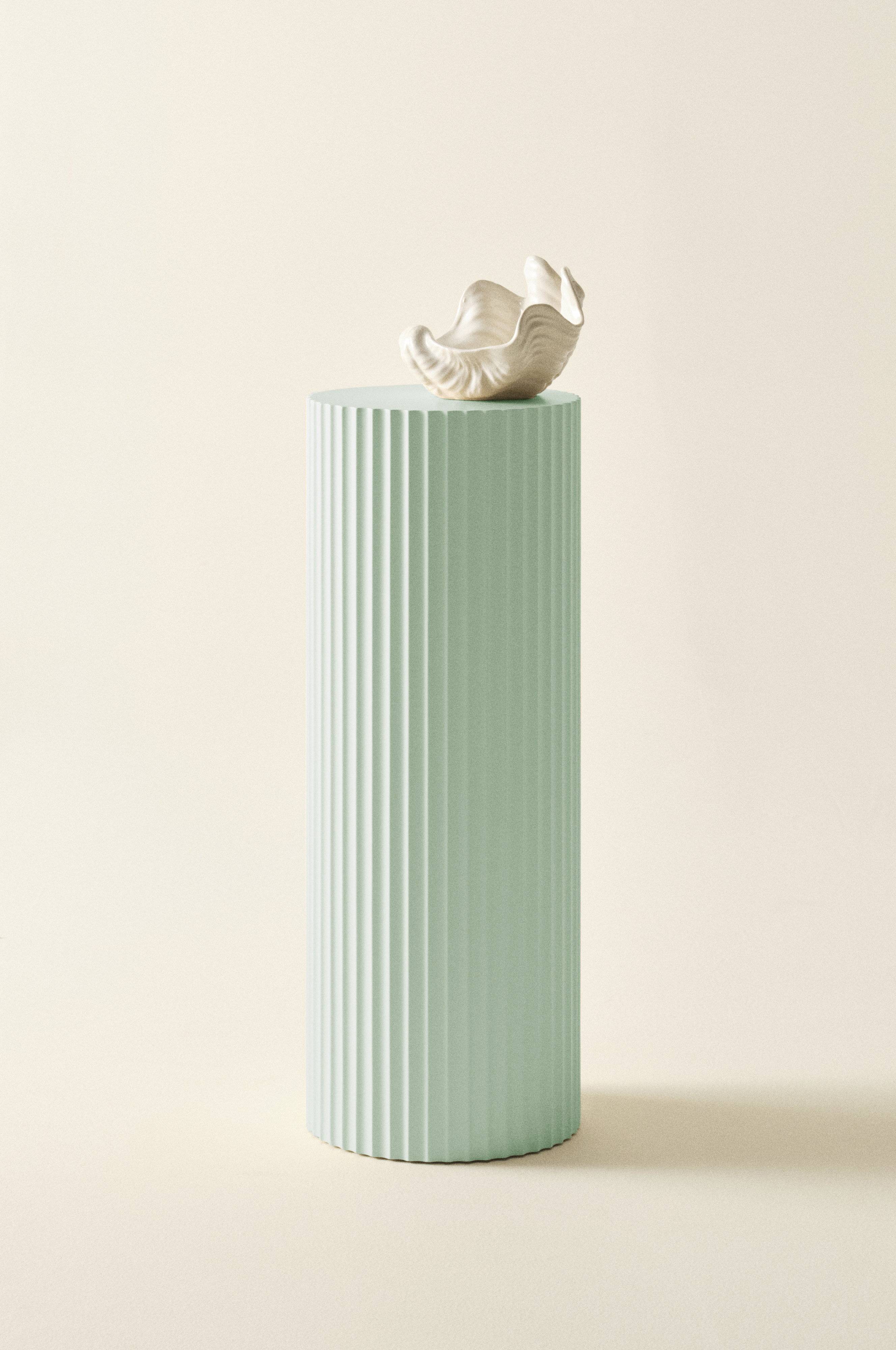 Okrągły stolik z płyty MDF oznaczonej certyfikatem FSC i pokrytej matowym lakierem. Gładki blat stolika odznacza się na tle żebrowanych boków. Stolik jest nieco wyższy i będzie się ślicznie prezentować jako podstawa dla zielonych roślin lub dekoracji.