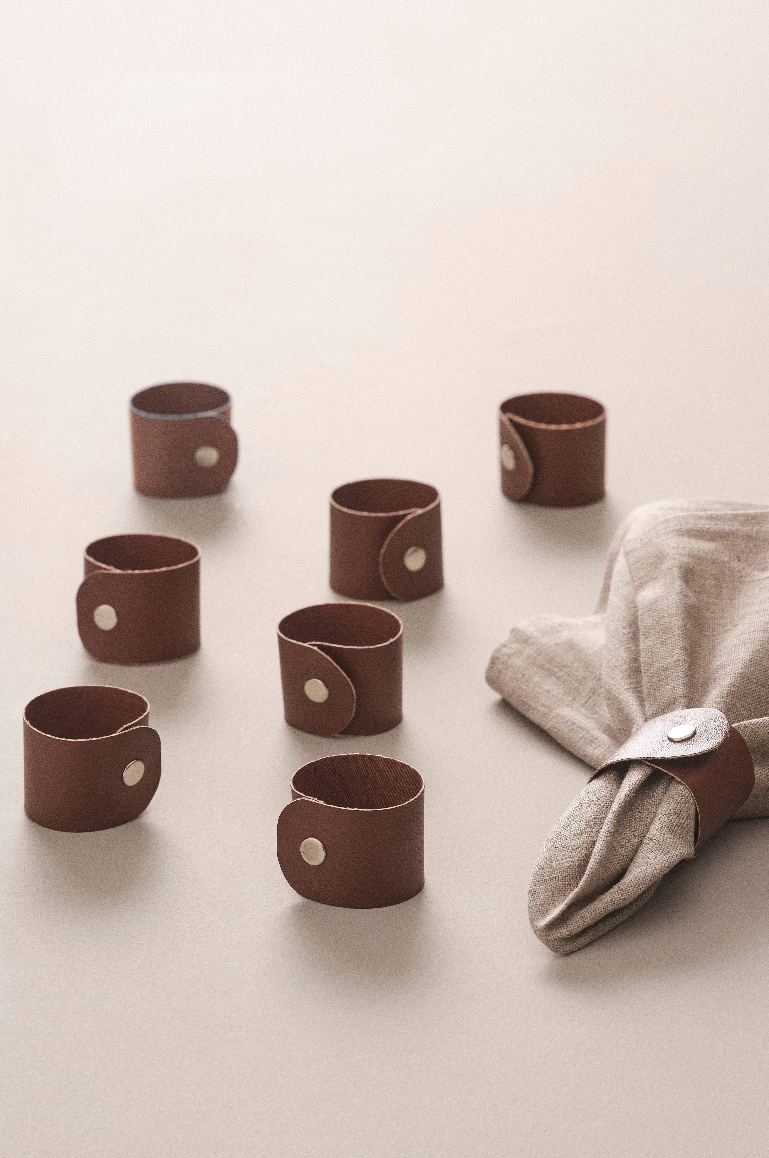 Osiem obrączek do serwetek ze sztucznej skóry wykonanej z poliuretanu. Obrączka zamyka się na zatrzask i pozwala stworzyć odświętne nakrycie.