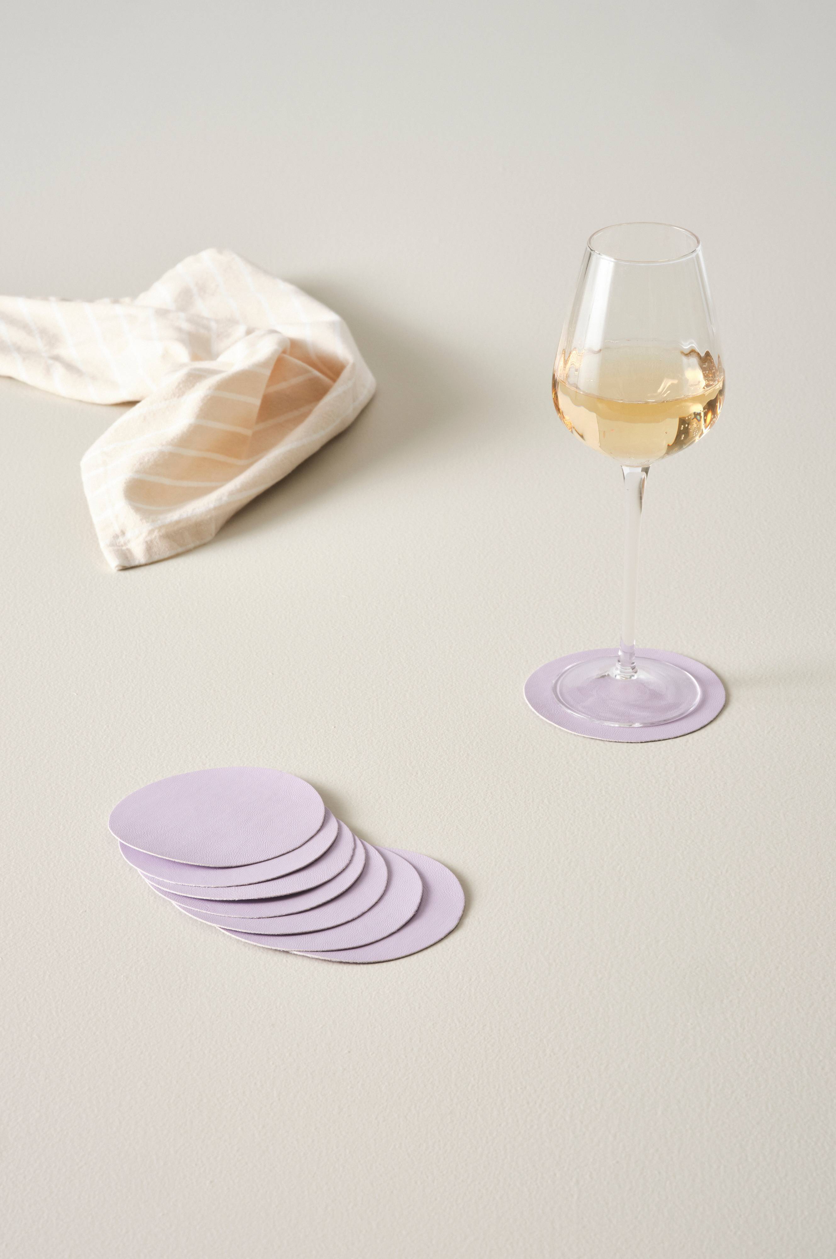 Osiem podkładek pod szklanki ze sztucznej skóry wykonanej z poliuretanu. Okrągłe podkładki pod szklanki zapewniają efektowne nakrycie oraz chronią stół przed plamami od płynów i gorąca. Dzięki nim odstawianie szklanek jest cichsze.