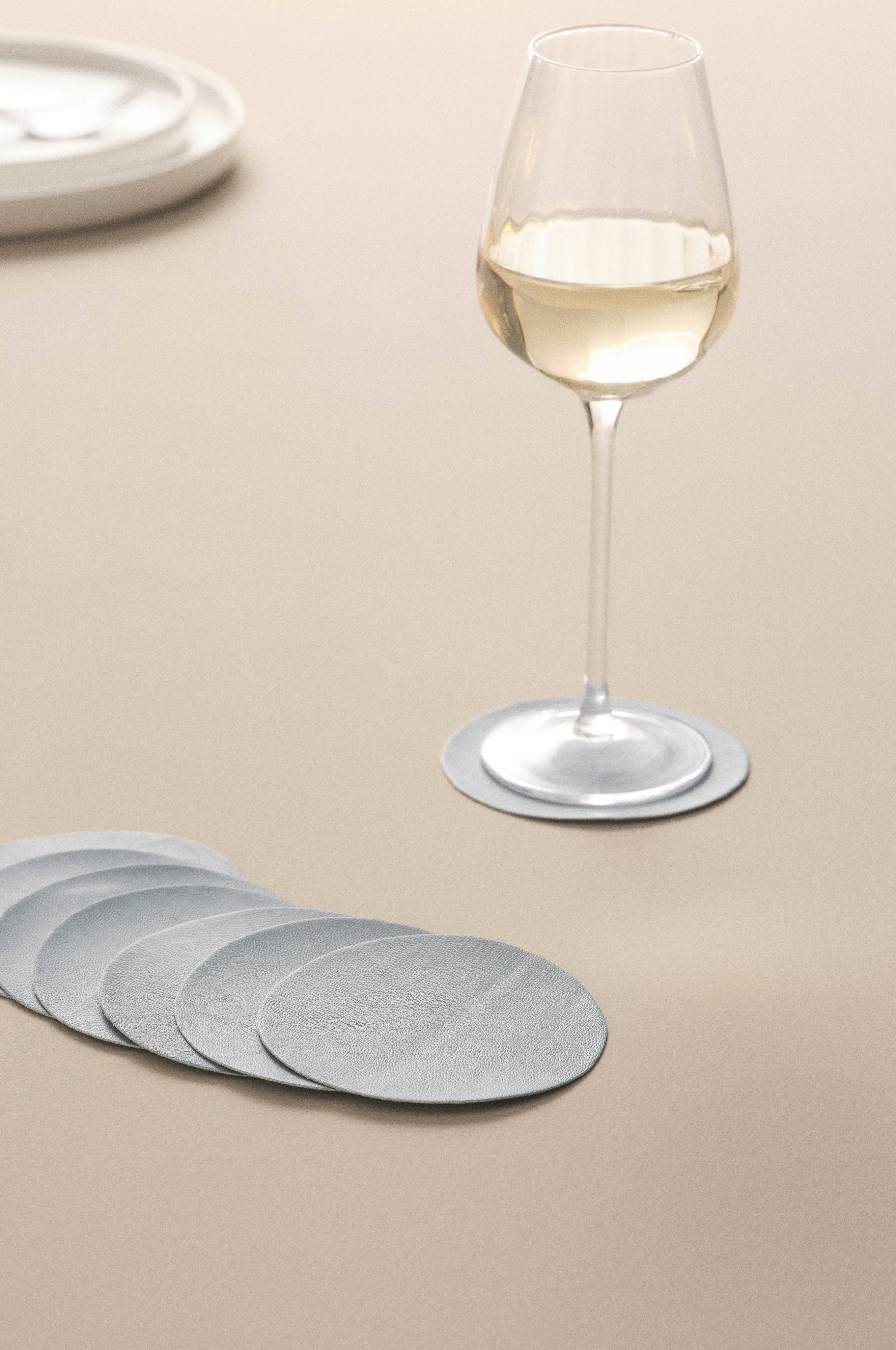 Osiem podkładek pod szklanki ze sztucznej skóry wykonanej z poliuretanu. Okrągłe podkładki pod szklanki zapewniają efektowne nakrycie oraz chronią stół przed plamami od płynów i gorąca. Dzięki nim odstawianie szklanek jest cichsze.