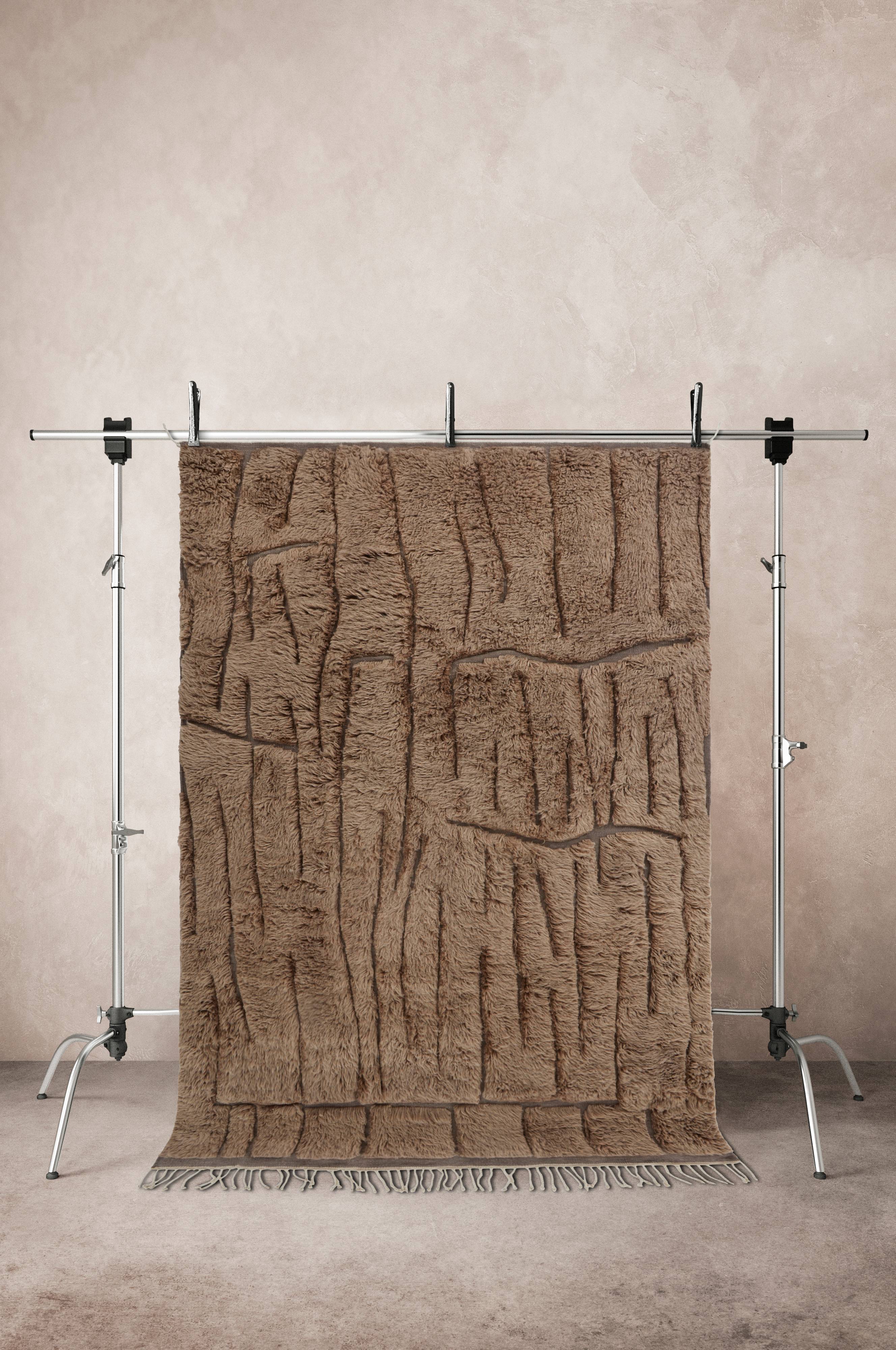 Tkany dywan z ręcznie plecionym runem z wełny. Ten piękny wzór tworzą odcinki dywanu bez runa, które dają wspaniały efekt. Nieregularny kształt wzoru jest zarazem dyskretny i dynamiczny. Brzegi dywanu wykończone są pięknymi, skręconymi frędzlami. Wełniany dywan zawsze zapewni ciepłe i przyjemne podłoże, które ma dodatkowo naturalną ochronę przed zabrudzeniami. Długość frędzli 12,5 cm. Długość włosia 4 cm. Grubość 5 cm. 2600 g/m².