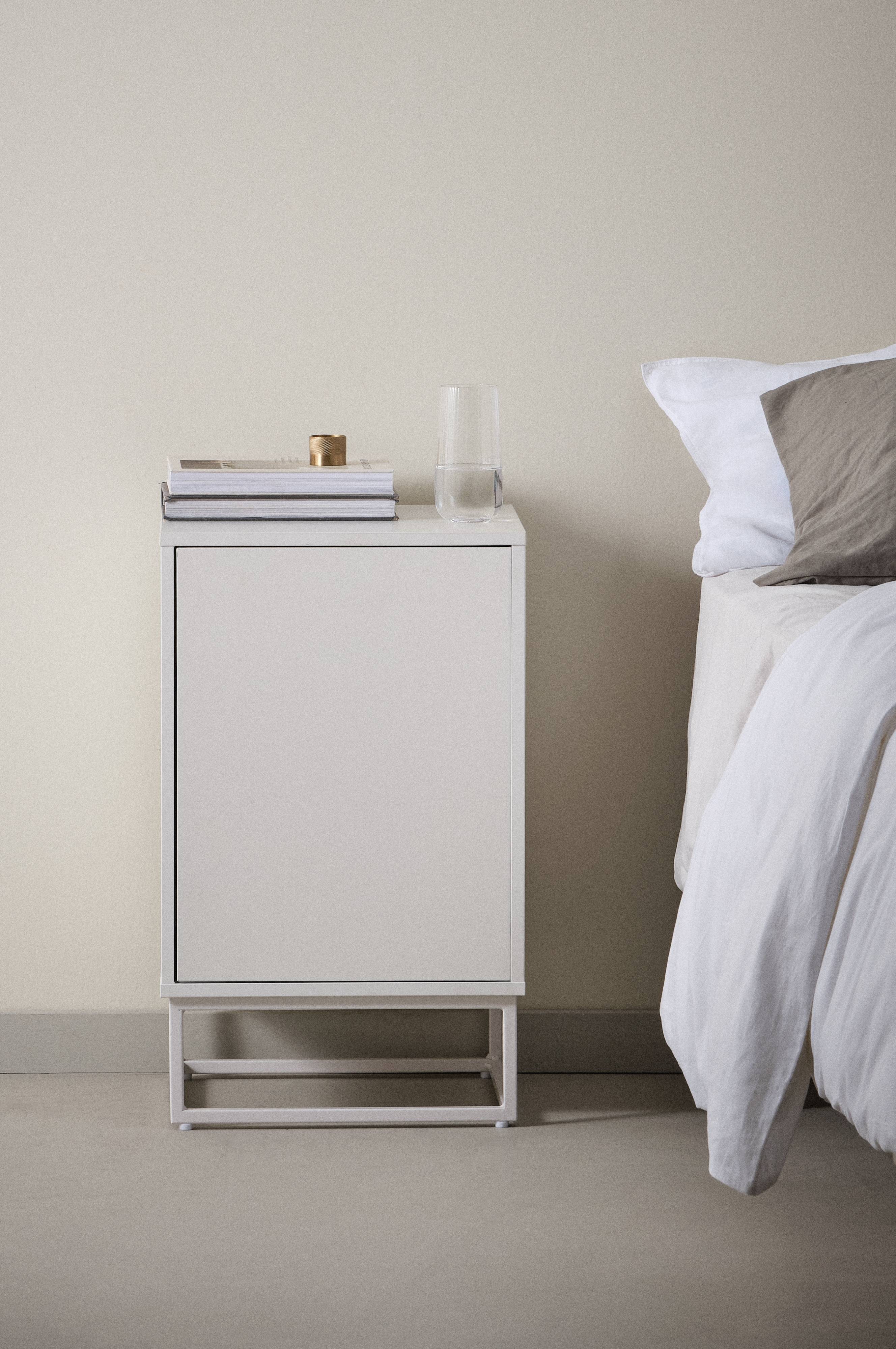 Stolik nocny z płyty MDF z metalową podstawą. Umieszczoną pod prostym i stylowym stolikiem szafkę wyposażono w drzwiczki z funkcją push. Dzięki temu drzwiczki są idealnie gładkie, nie mają uchwytu, a mimo to łatwo je otworzyć. W szafce znajduje się jedna półka. Części wykonane z MDF zostały pokryte lakierem na bazie wody. Prostokątna podstawa jest lakierowana proszkowo. Dzięki mocowaniom stolik może zostać przymocowany do ściany, jeśli zajdzie taka potrzeba. Wymaga częściowego montażu. Do produktu dołączona jest instrukcja montażu.