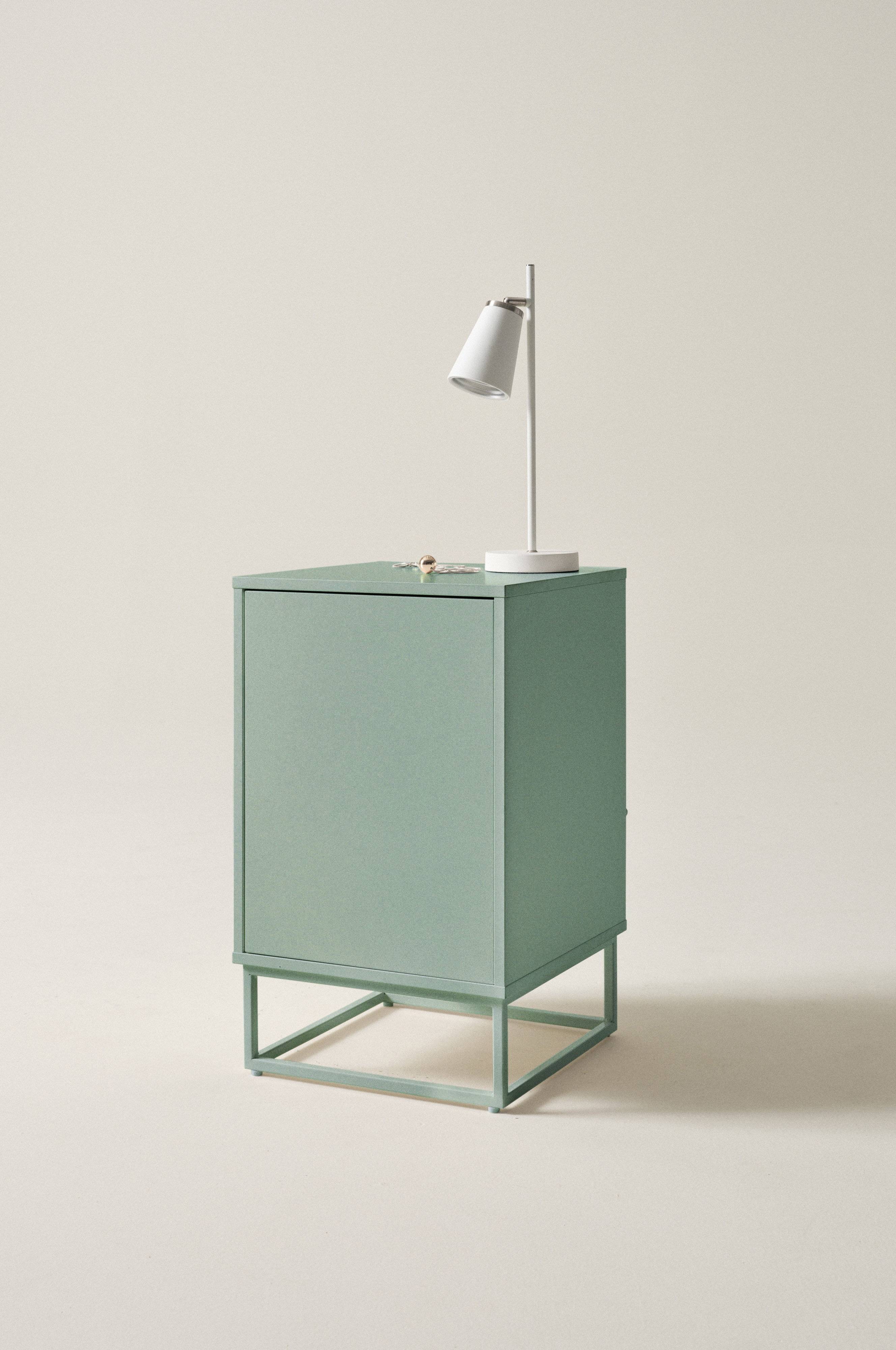 Stolik nocny z płyty MDF z metalową podstawą. Umieszczoną pod prostym i stylowym stolikiem szafkę wyposażono w drzwiczki z funkcją push. Dzięki temu drzwiczki są idealnie gładkie, nie mają uchwytu, a mimo to łatwo je otworzyć. W szafce znajduje się jedna półka. Części wykonane z MDF zostały pokryte lakierem na bazie wody. Prostokątna podstawa jest lakierowana proszkowo. Dzięki mocowaniom stolik może zostać przymocowany do ściany, jeśli zajdzie taka potrzeba. Wymaga częściowego montażu. Do produktu dołączona jest instrukcja montażu.